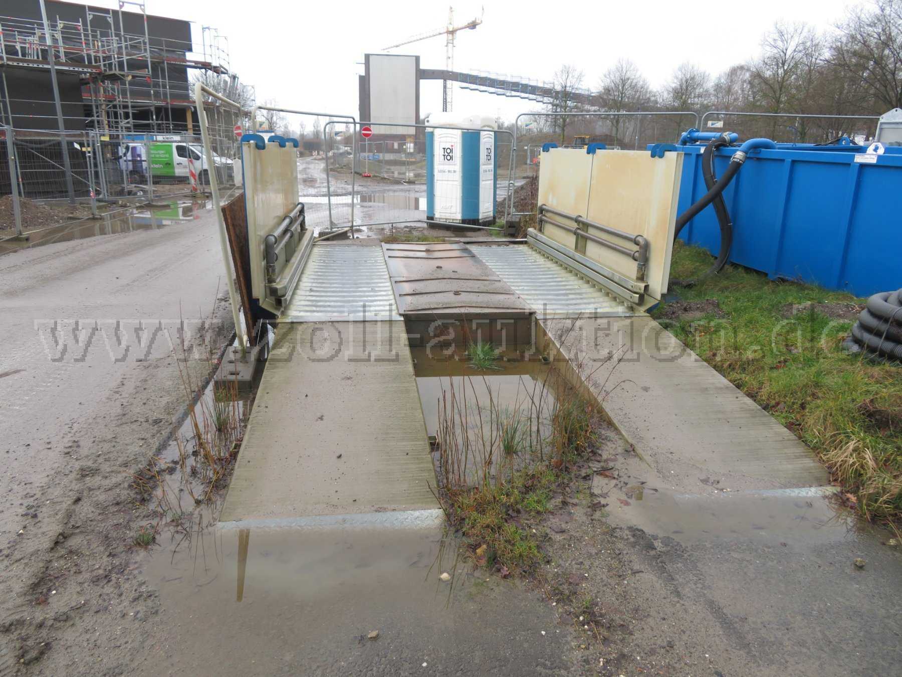 • Zwei massive, feuerverzinkte Waschmodule (links/rechts) mit integriertem Schmutzwasserablauf, ausgeführt in selbsttragender Stahlkonstruktion aus wasserführendem Rechteckstahlrohr und Winkelprofilen. Die Module sind 37,5 cm hoch auf GOK gestellt. 3 zur Schmutzwasserrückführung abgeschrägte Mittelteile aus feuerverzinktem Riffelblech Statisches Düsensystem zur lückenlosen Wäsche der Reifenprofile, Radflanken, Radinnenseiten und Teilbereiche des unteren Chassis Statisches Düsensystem zur lückenlosen Wäsche der Reifenprofile, Radflanken, Radinnenseiten und Teilbereiche des unteren Chassis