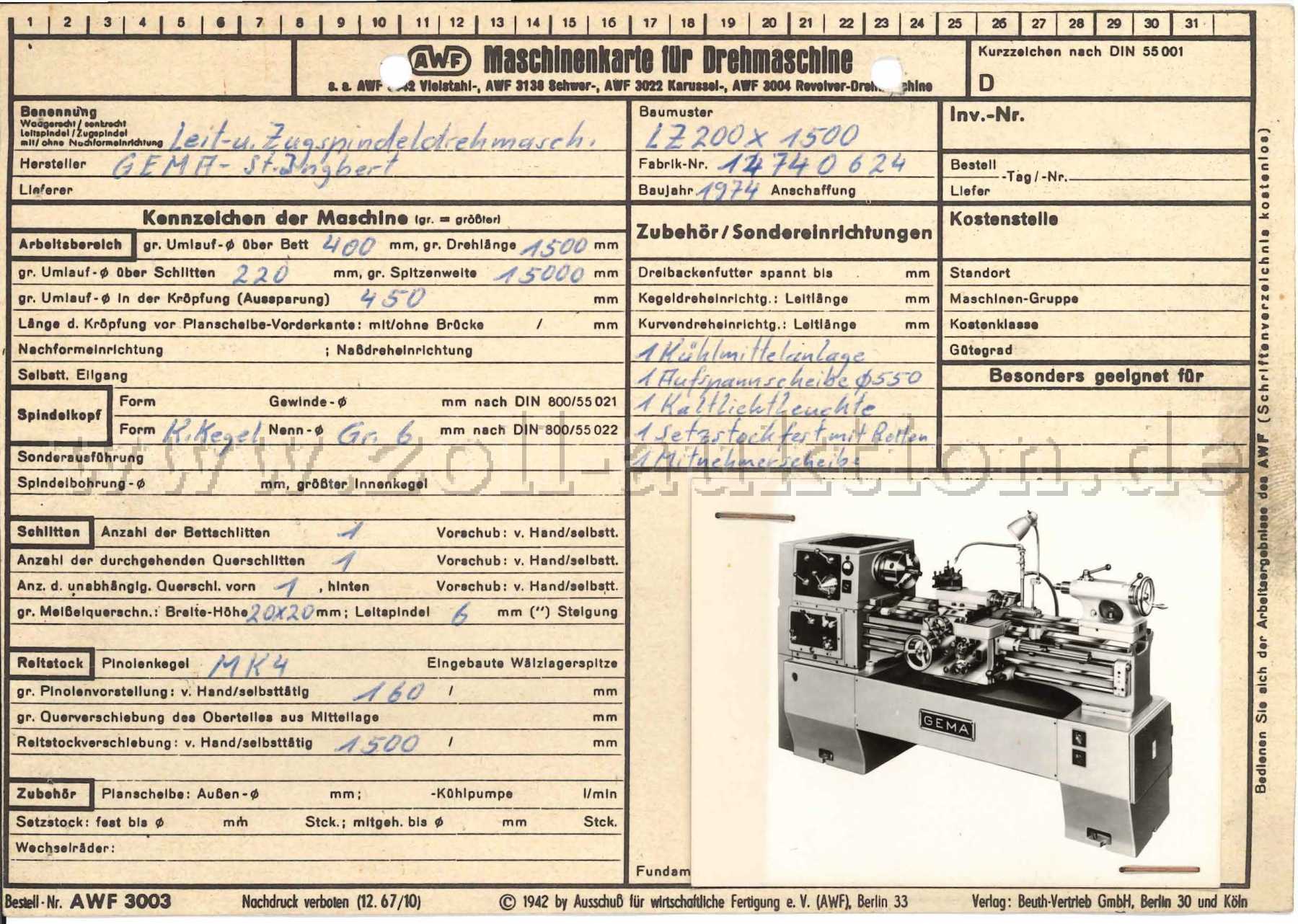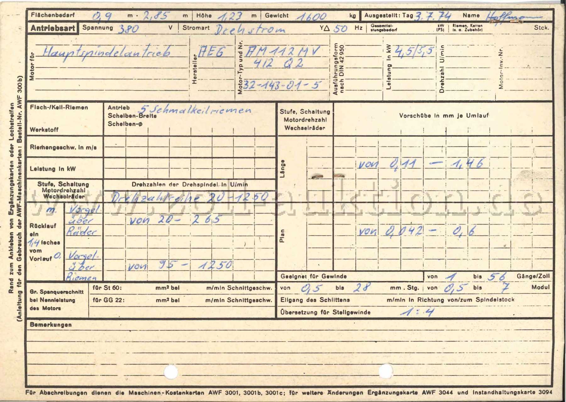 weitere technische Angaben siehe anliegende Maschinenkarte