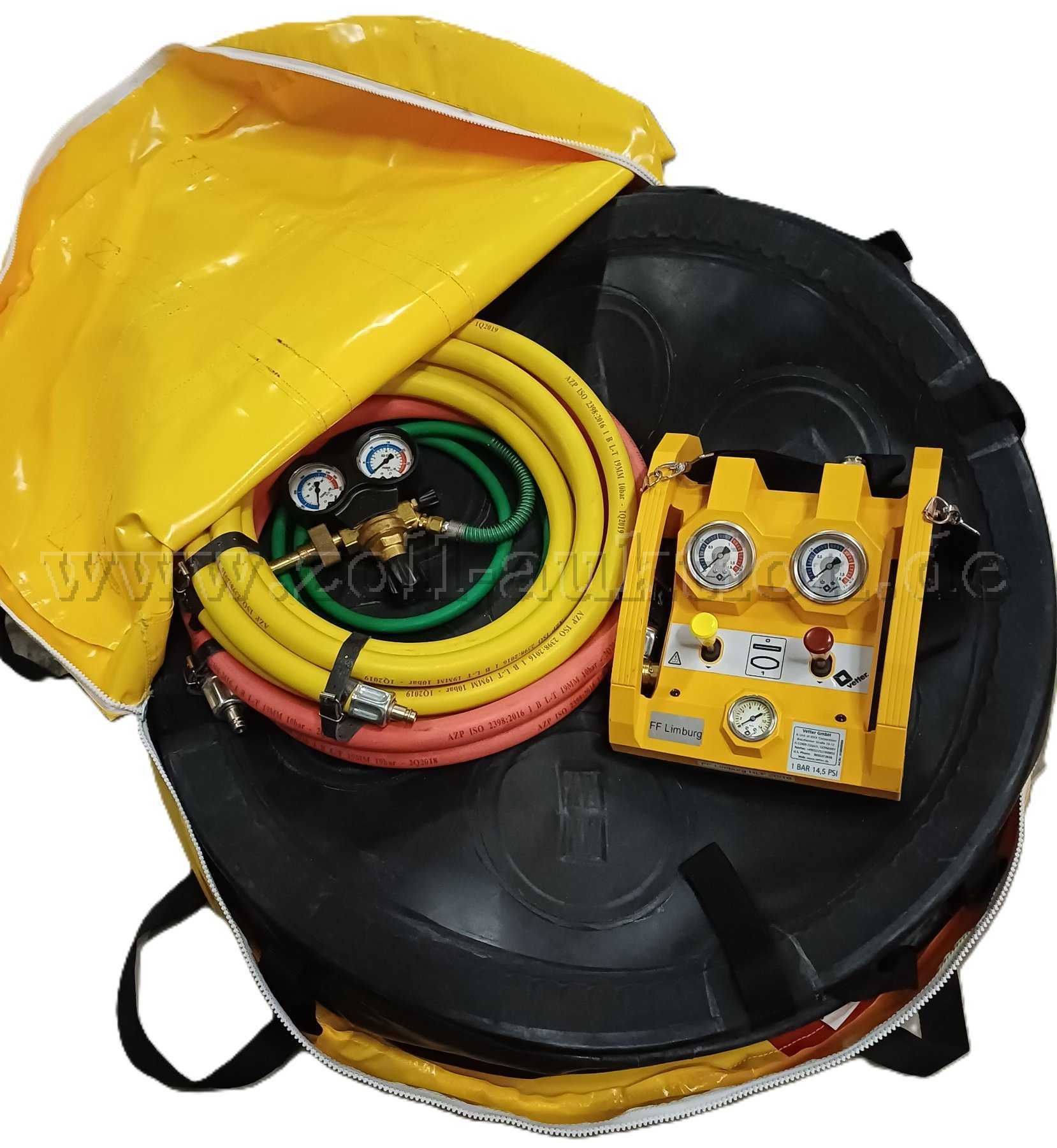 Satz bestehend aus: Hebekissen LH30S Typ 1/13, Füllschlauch rot 1bar, Füllschlauch gelb 1bar, Doppelsteuerorgan 1bar, Druckminderer 200/300bar, Aufbewahrungstasche Gelb.