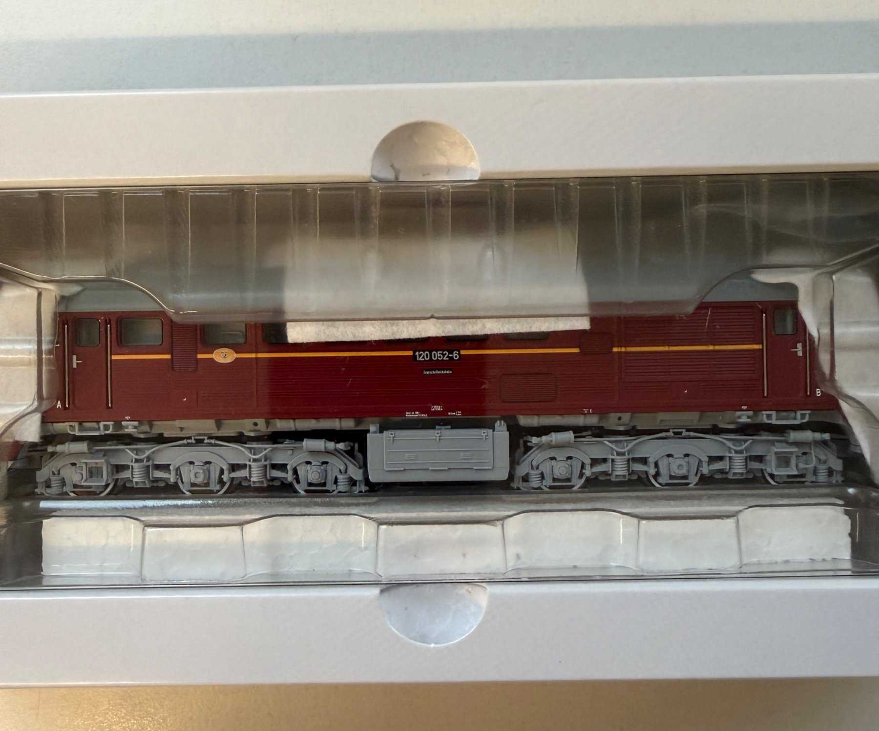 - Beschreibung: Märklin H0 39200 Diesellokomotive BR 120 – Taigatrommel – der Deutschen Reichsbahn. Epoche IV. Mit mfx+-Decoder und Sound. 3-Licht-Frontbeleuchtung und 2 rote Schlusslichter mit der Fahrtrichtung wechselnd, digital schaltbar. Führerstandbeleuchtung und Maschinenraumbeleuchtung digital schaltbar