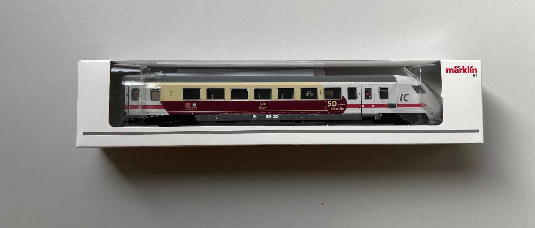 - Märklin H0 43630.001 IC-Steuerwagen 2. Klasse der Deutsche Bahn AG. Ausführung im 50-Jahre-Intercity-Design. Epoche VI. Sondermodell für die Händler-Initiative „Die Wilde 13+“. Mit mfx-Decoder. Dreilicht-Spitzenbeleuchtung und 2 rote Schlusslichter an der Führerstandsseite mit der Fahrtrichtung wechselnd, digital schaltbar. Fernlicht digital schaltbar. Führerstandsbeleuchtung digital schaltbar. Innenbeleuchtung digital schaltbar. Trennbare stromführend Kupplung digital schaltbar. Über die Kupplung kann die Innenbeleuchtung der weiteren Wagen des Zugverbands geschaltet werden.