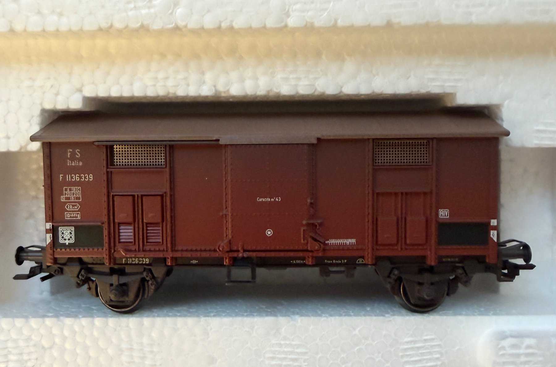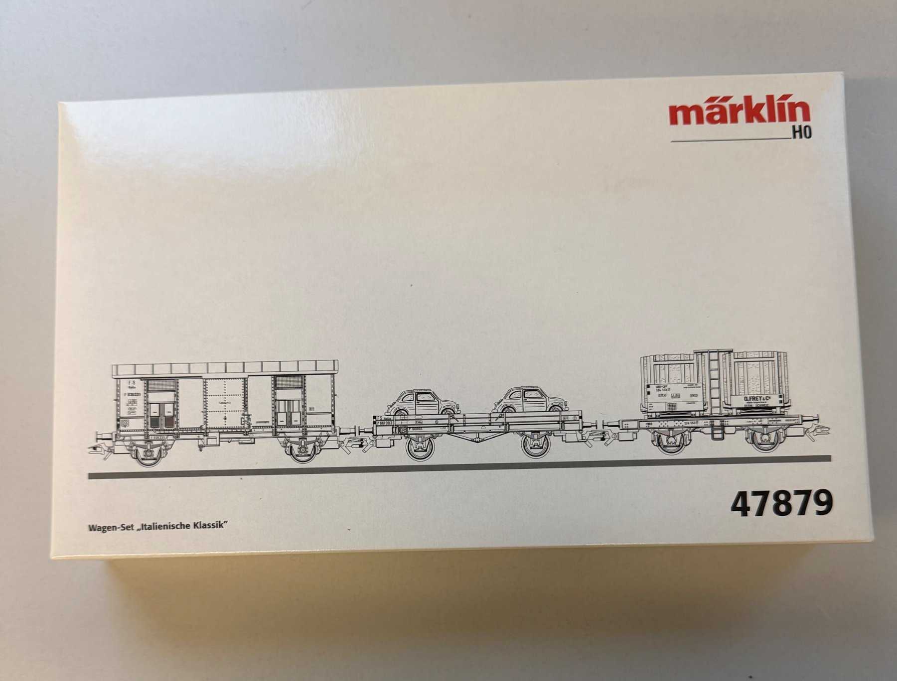 - Beschreibung: Märklin H0 47879 Wagenset Italienische Klassik, bestehend aus einem Niederbordwagen Typ X, einem gedeckter Wagen Typ F mit Spitzdach und einem Schweizer Fasswagen für italienischen Wein. Epoche III. Alle Modelle ab Werk leicht gealtert. Fasswagen mit Holzfässern. Zwei Fiat-500-Modelle der Firma Busch liegen als Ladegut für den Niederbordwagen bei. Haltekleine liegen ebenfalls bei. Unbespielt. Radsätze der Wagen teilweise leicht angelaufen. Umverpackung an der Oberseite teilweise leicht vergilbt