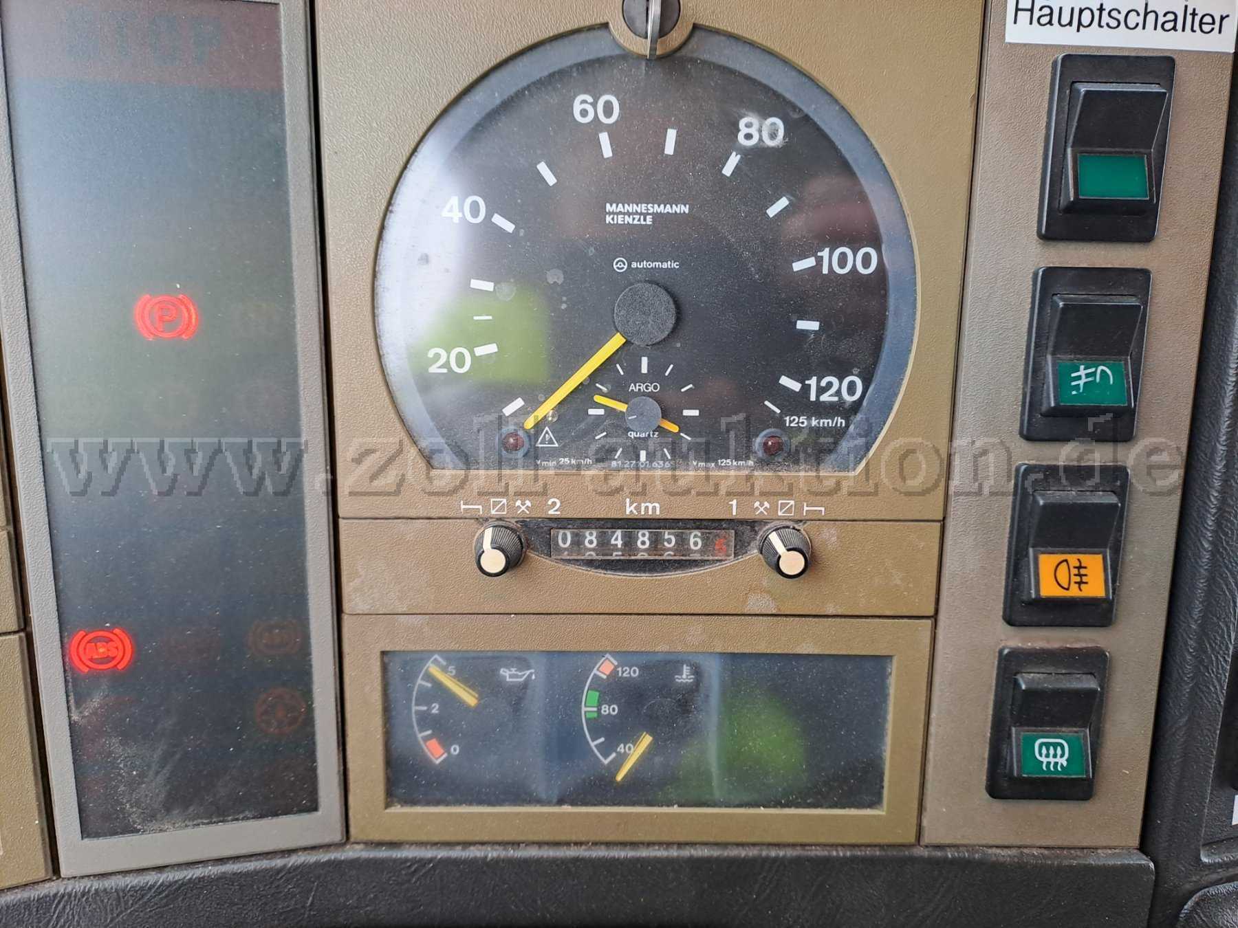 Fahrzeugseite weist die Aufbautür ebenfalls Materialabtrag auf, im hinteren Bereich sind Spuren von Nachlackierungen erkennbar. An der C-Säule rechts ist ein beginnender Korrosionsansatz sichtbar. Am Aufbau hinten rechts ist ein leichter Lackabtrag an der Kante zum Pumpenraum erkennbar, während am Rollladen des Pumpenraums oben rechts eine Delle vorhanden ist. Die Trittleiter lässt sich ordnungsgemäß bedienen. Der Dachbereich zeigt keine besonderen Schäden, sondern lediglich übliche Gebrauchsspuren. Auf der linken Fahrzeugseite finden sich oberflächliche Lackabplatzungen mit teilweisem Korrosionsansatz. An der linken hinteren Aufbautür sind leichte Oberflächenkratzer festzustellen, die C-Säule wurde im Bereich der Türfall nachlackiert. Die Klappen G1 und G2 sind schwergängig, die Dämpfer sind korrodiert. Unterhalb des G1-Fachs ist eine Delle mit Oberflächenkratzern erkennbar. Die Rollläden G2 und G4 sind unbeschädigt, die Dichtungen im unteren Bereich jedoch altersbedingt geschrumpft, aber noch vorhanden. Die Fahrertür weist an der Kante Lackabtrag sowie übliche Gebrauchsspuren auf. Im Innenraum sind diverse Bohr- und Schraublöcher an der Instrumententafel vorhanden, die von feuerwehrtypischen Einbauten stammen. Der Fahrersitz zeigt an der Sitzwange altersbedingte Schwächen, während auch der Beifahrersitz Gebrauchsspuren und eine altersbedingte Schwächung erkennen lässt.