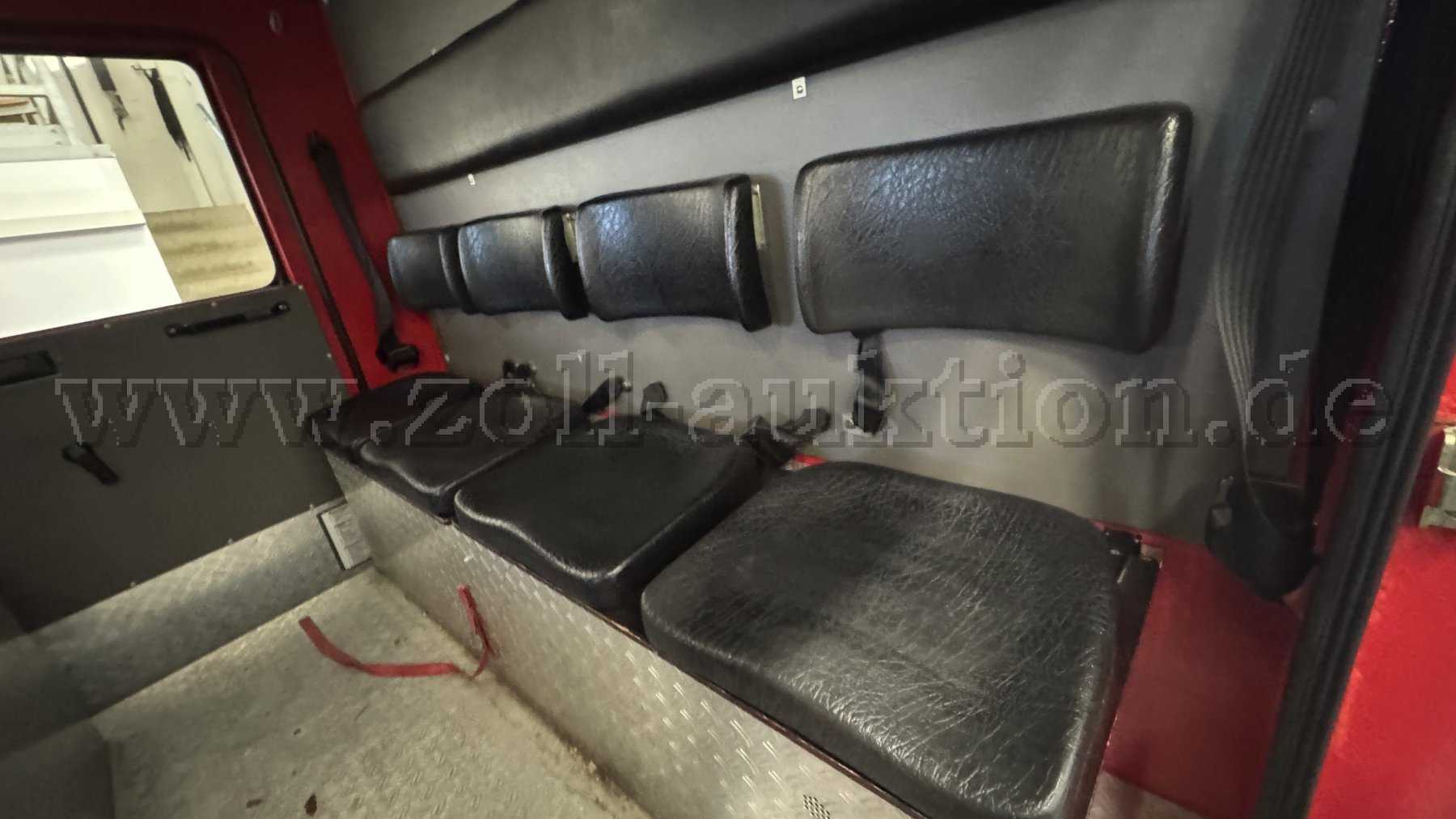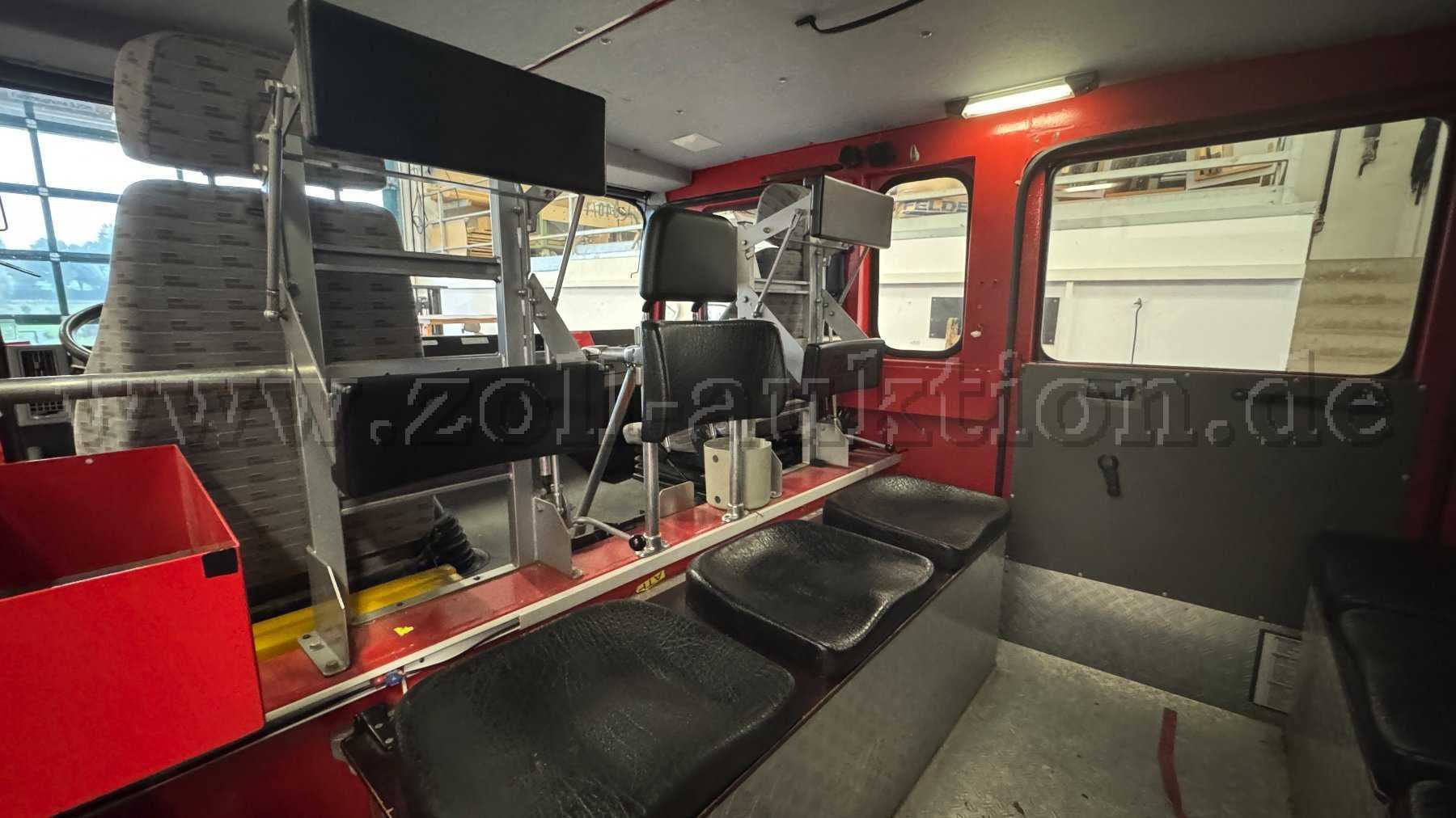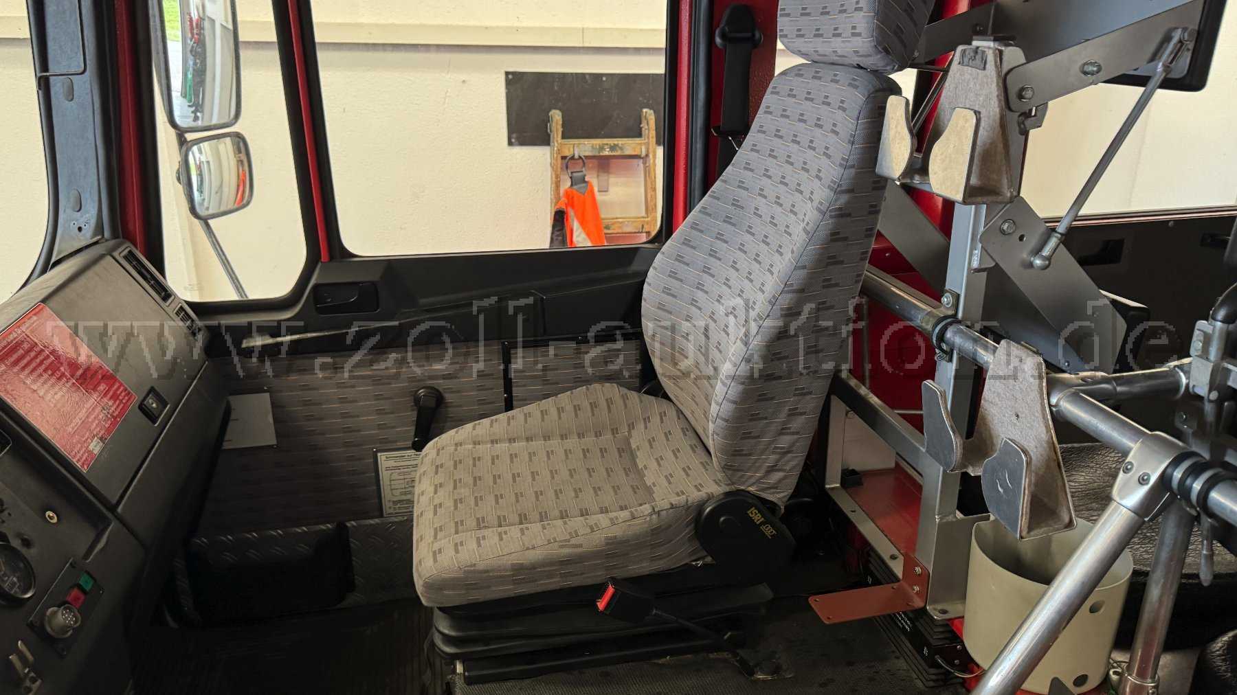 feuerwehrtypischen Einbauten stammen. Der Fahrersitz zeigt an der Sitzwange altersbedingte Schwächen, während auch der Beifahrersitz Gebrauchsspuren und eine altersbedingte