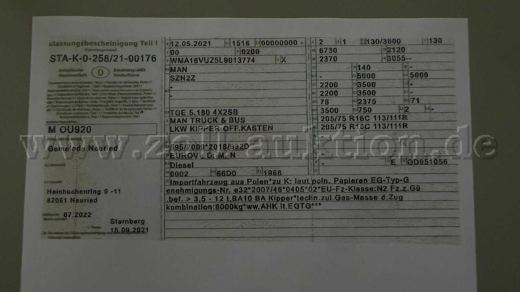 Zur Versteigerung steht ein MAN TGE 5.180 des Bauhofes der Gemeinde Neuried. Mängel entnehmen Sie bitte der unten aufgeführten Beschreibung.