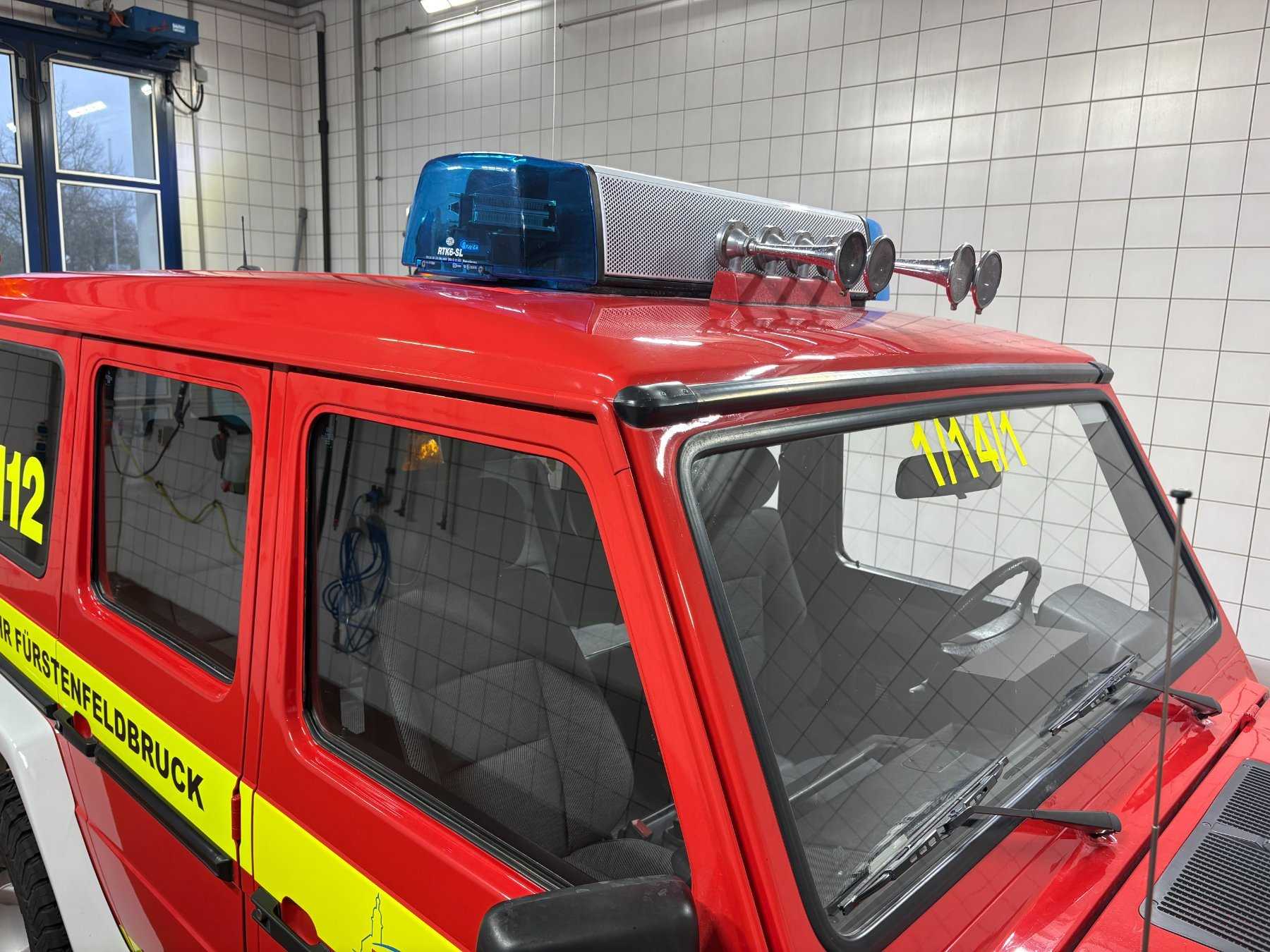Beklebung mit Hoheitszeichen und Schriftzügen der Feuerwehr Fürstenfeldbruck ist vom Erwerber umgehend zu entfernen. Für eine private oder gewerbliche Nutzung ist ein Rückbau der Sondersignalanlage mit anschließender Begutachtung zur Anpassung der Betriebserlaubnis erforderlich. Die Sondersignalanlage ist bei nicht vorhandener Berechtigung zu entfernen. Das Fahrzeug wird ohne Funktechnik versteigert.