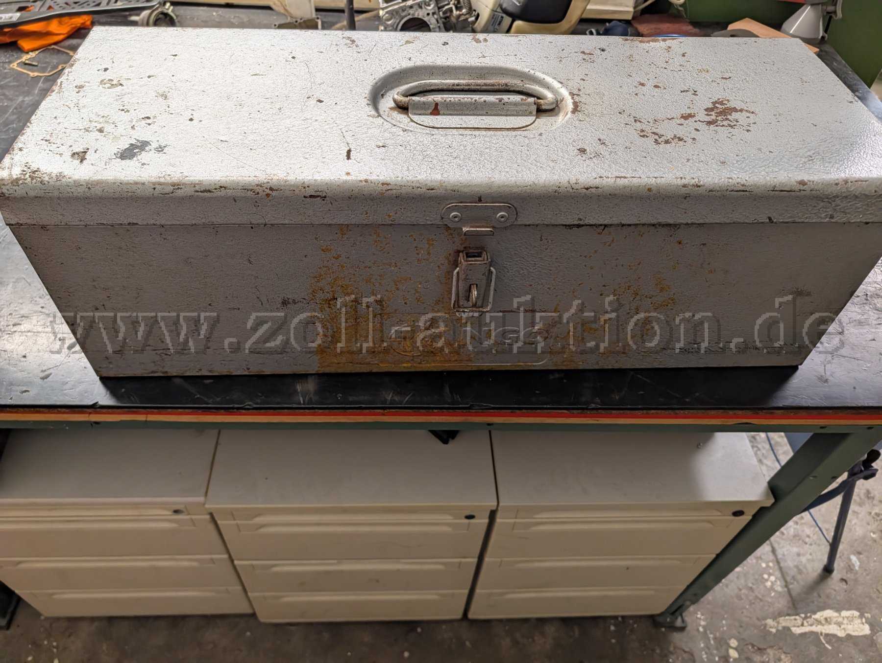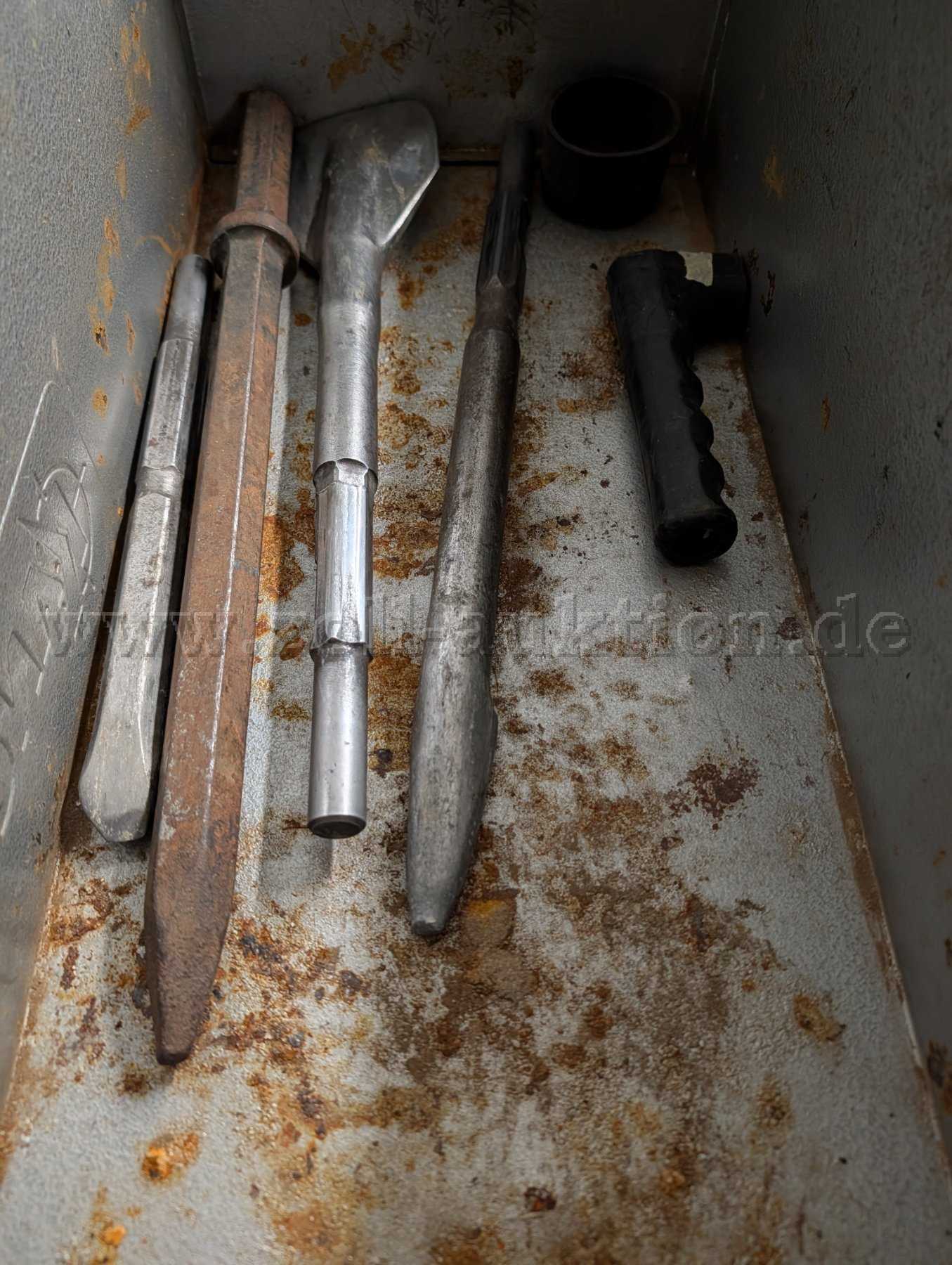 Lieferumfang: Meißelhammer, Transportkoffer (Blech), 4 verschiedene gebrauchte Meißel mit Abnutzungsspuren