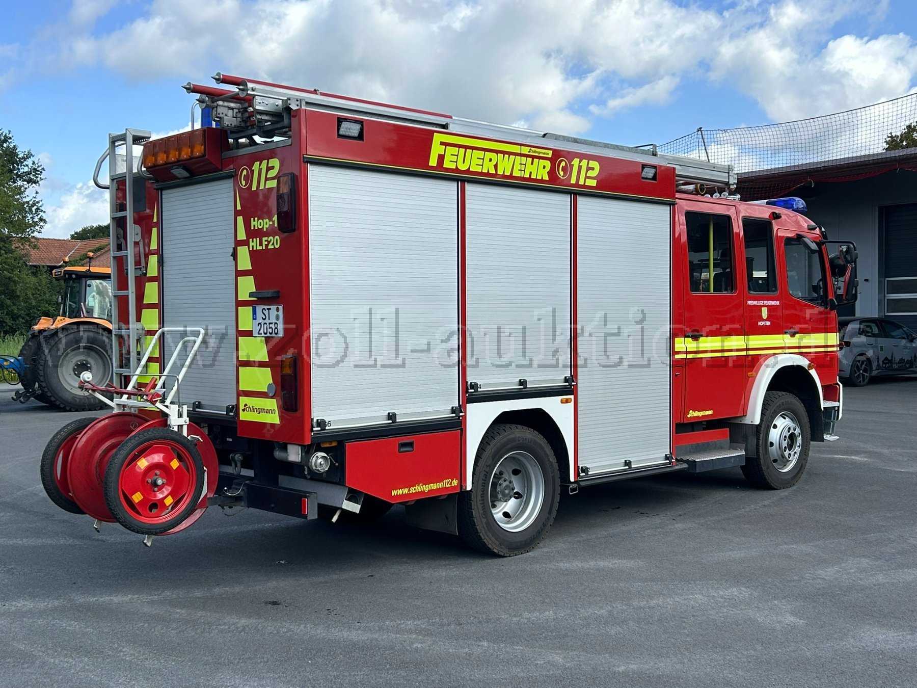 Die auf den Bildern erkennbare feuerwehrtechnische Beladung ist ausdrücklich nicht Bestandteil dieser Auktion und wird zur Übergabe entnommen. Zudem ist das vorhandene Martinhorn (Presslufthorn) demontiert. Es verbleibt lediglich am Fahrzeug: Schlauchhaspel am Heck, Leitern
