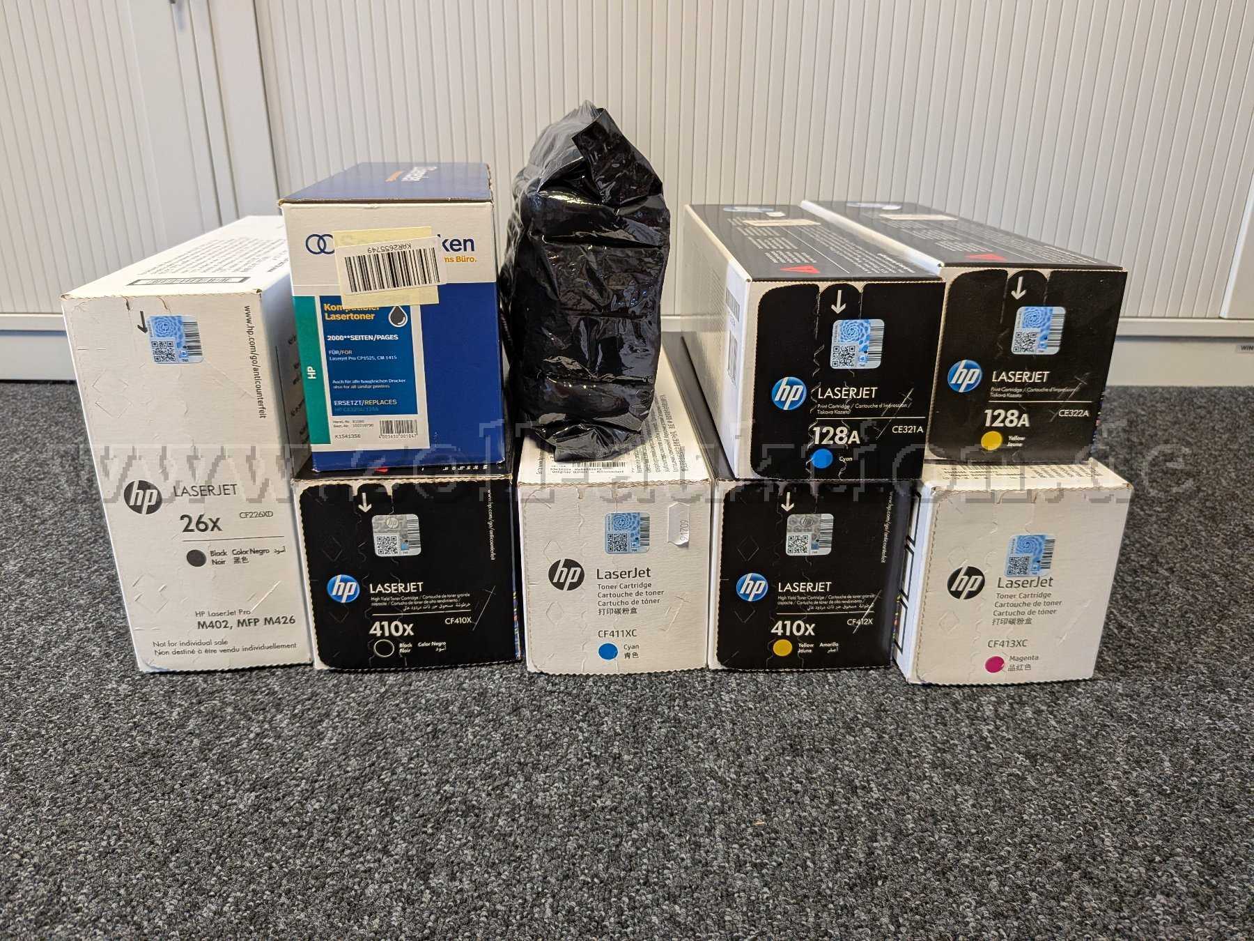 Versteigert werden 8 Original HP Laserjet (Toner) Druckerpatronen sowie ein kompatibler Toner für HP Laserjet Pro CP1525, CM 1415; die Druckerpatronen stammen aus Behördenbestand.