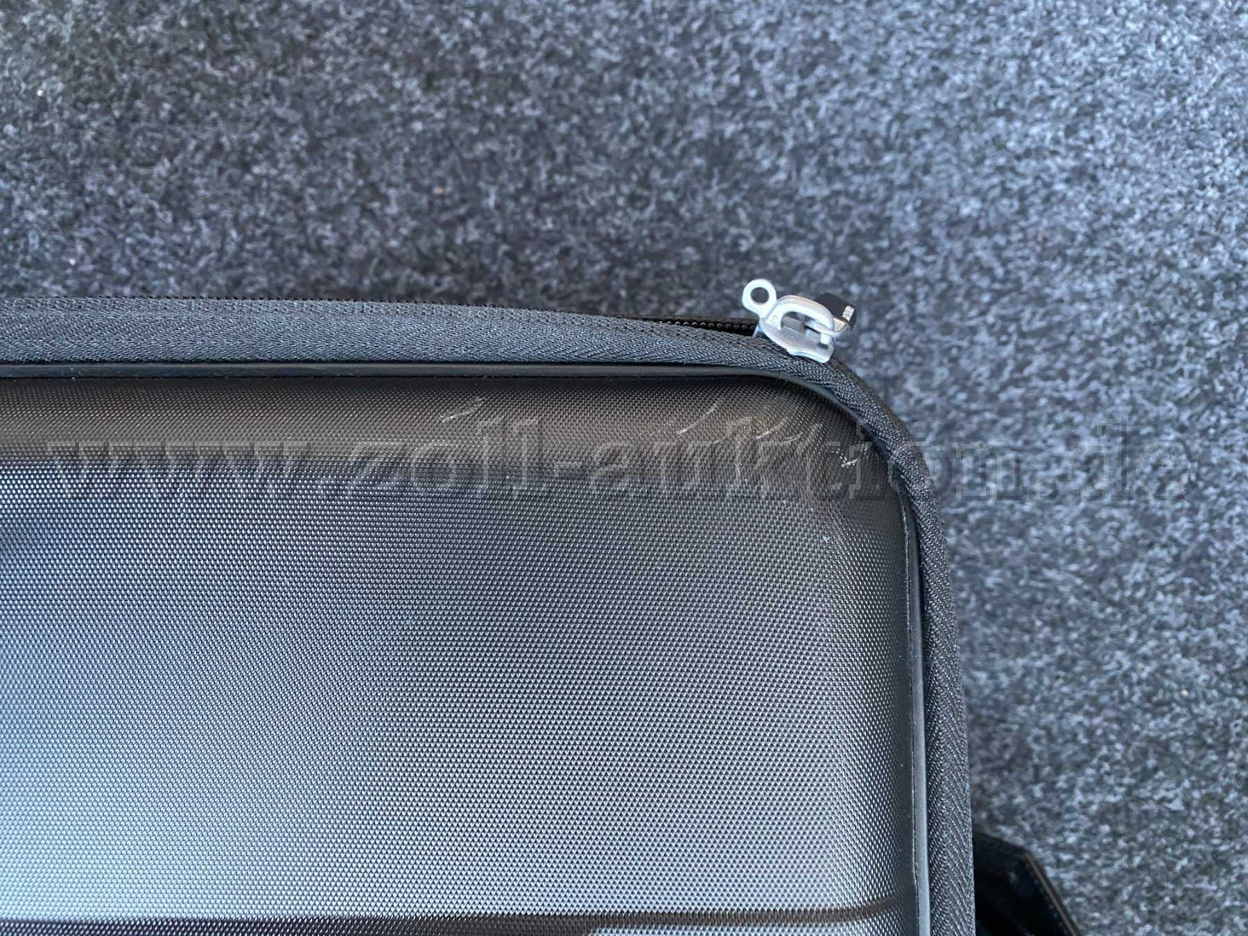- Innenraum: 2 mittelgroße, flache Reißverschlusstaschen mit Visitenkartenfach, einem geräumigen Bekleidungsfach mit verstellbaren Trägern und Reißverschluss sowie einer großen, flachen Reißverschlusstasche