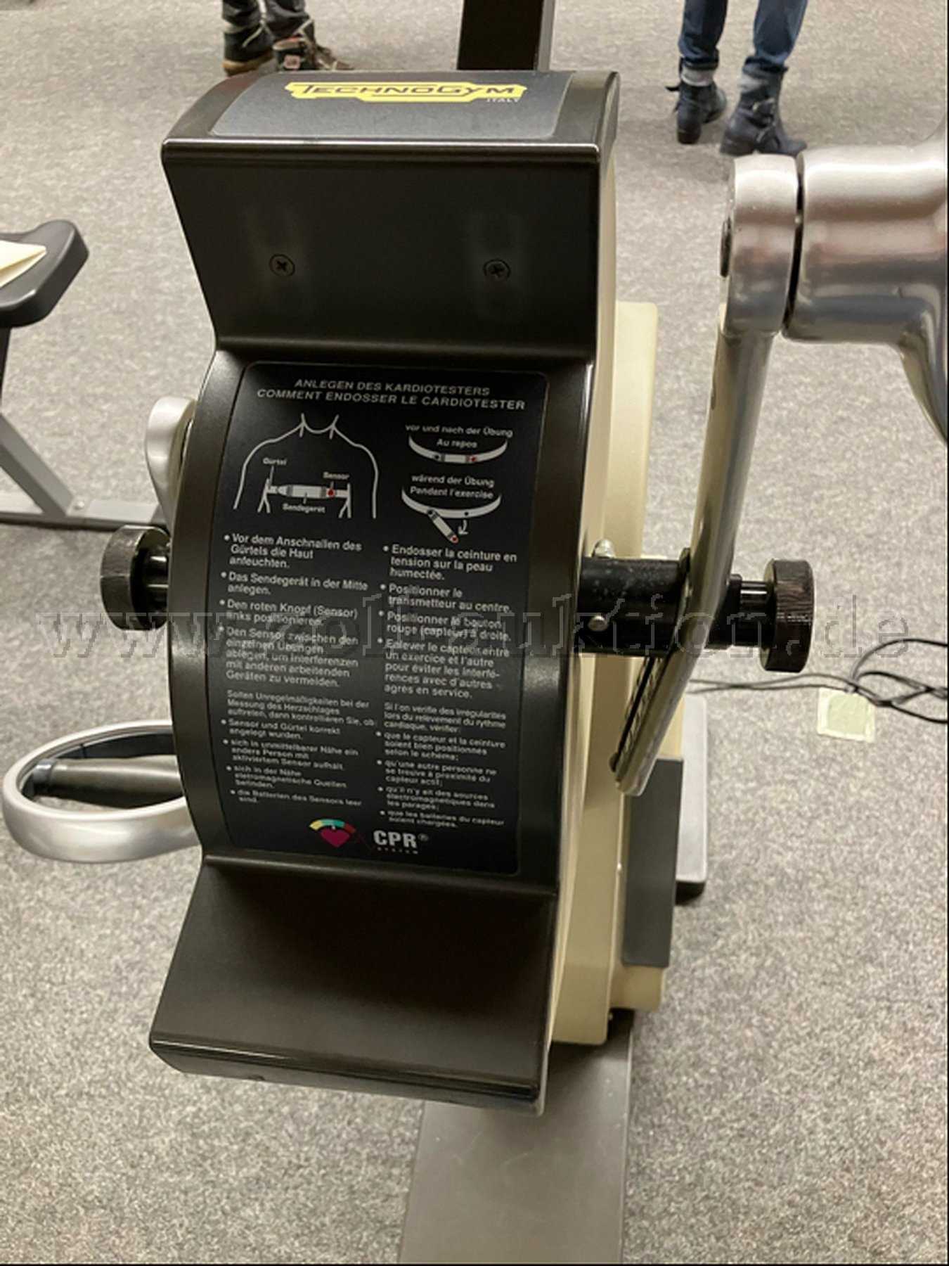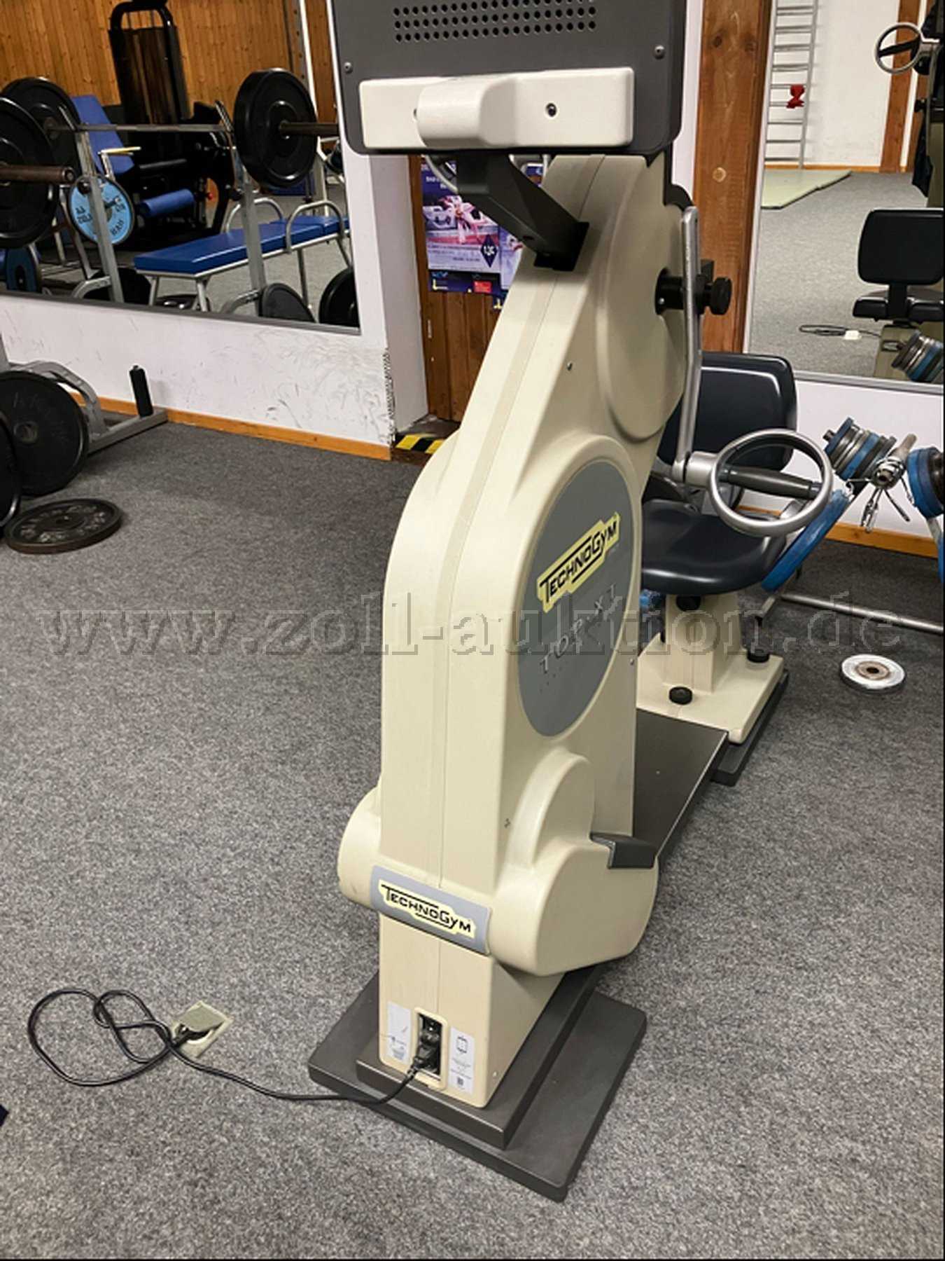 Auszugsweise Beschreibung: Hersteller: TechnoGYM (Made in Italy) / Modellbezeichnung: TOP-XT. Es handelt sich um ein professionelles Sportgerät („Hand Bike“) in massiver Studiobauweise; mit Vorwärts- Rückwärtswiderstand, einstellbarer Handkurbelhöhe sowie drehbaren Griffen aus Edelstahl. Kunststoff-Sitz (schwarz) manuell verschiebbar, abwaschbar. Herstellerseits mit integriertem Ergometer + elektronischer Fitness-Programm-Auswahl. 2 zusätzlichen Scart-Anschlüssen auf der Rückseite vorhanden. Eine elektrotechnische Funktionsüberprüfung blieb anbieterseits aus, was bei der Ermittlung des Mindestgebotes entsprechend berücksichtigt wurde. Ein Typenschild ist nicht vorhanden. Das Studiogerät befindet in einem funktionsfähigen und seines Altes in einem als befriedigend anzusehenden Zustand. Außenmaßen aufgebaut: HxBxT = ca. 180x53x170 cm. Gewicht ca. 120 Kg. Maximales Benutzergewicht lt. Herstellerangabe: 160 Kg. Eine am Gerät befindliche CE-Kennung fehlt, sodass dieser Artikel vor 1993 hergestellt wurde.