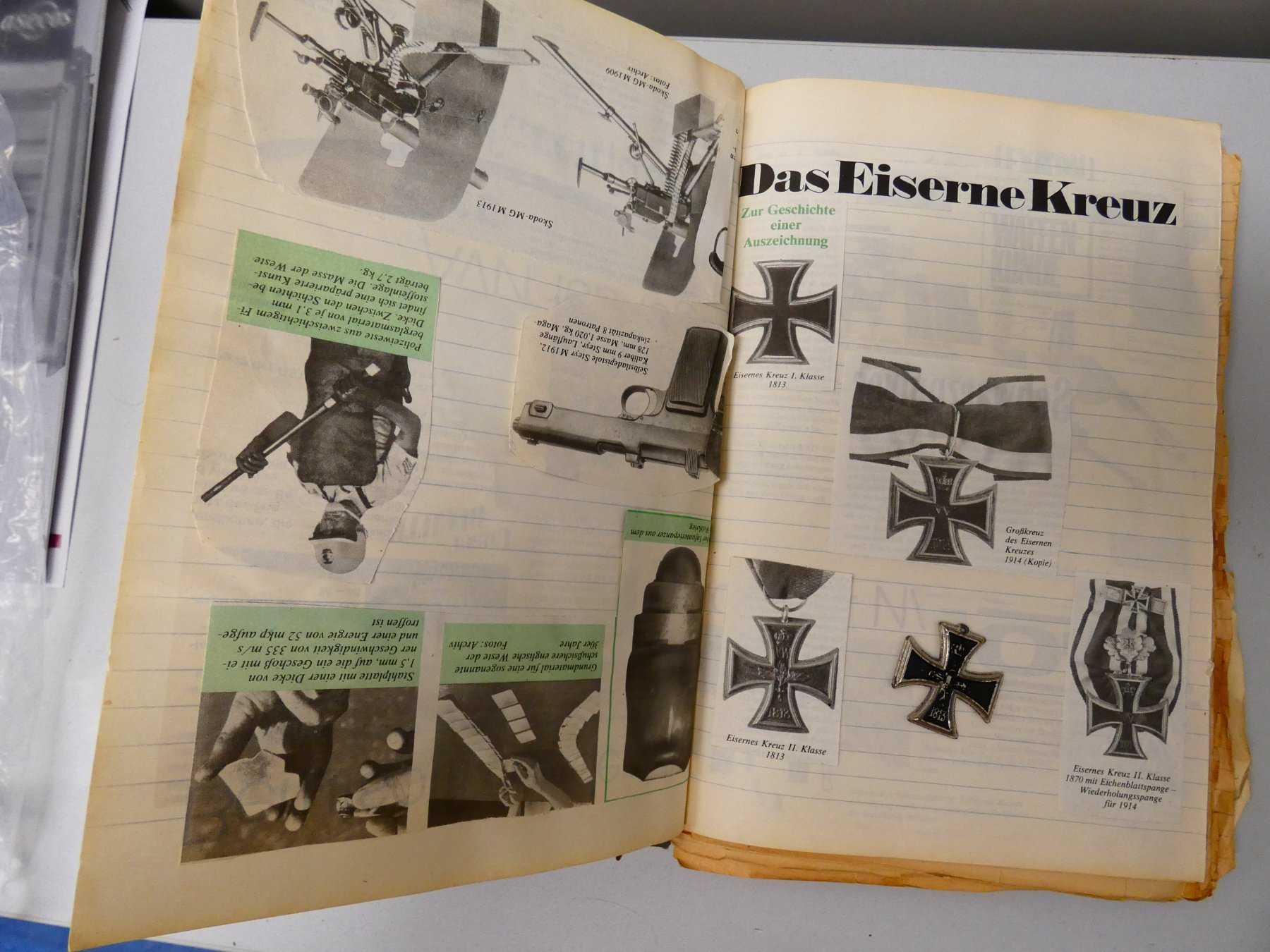 4. Notizbuch: stark abgenutzt, an den Rändern stark zerfleddert, Buchrücken ist oben eingerissen und unten ist ein leichter Riss. Inhalt: Gesammelte Ausschnitte aus Zeitungen/ Zeitschriften zum Thema Militär