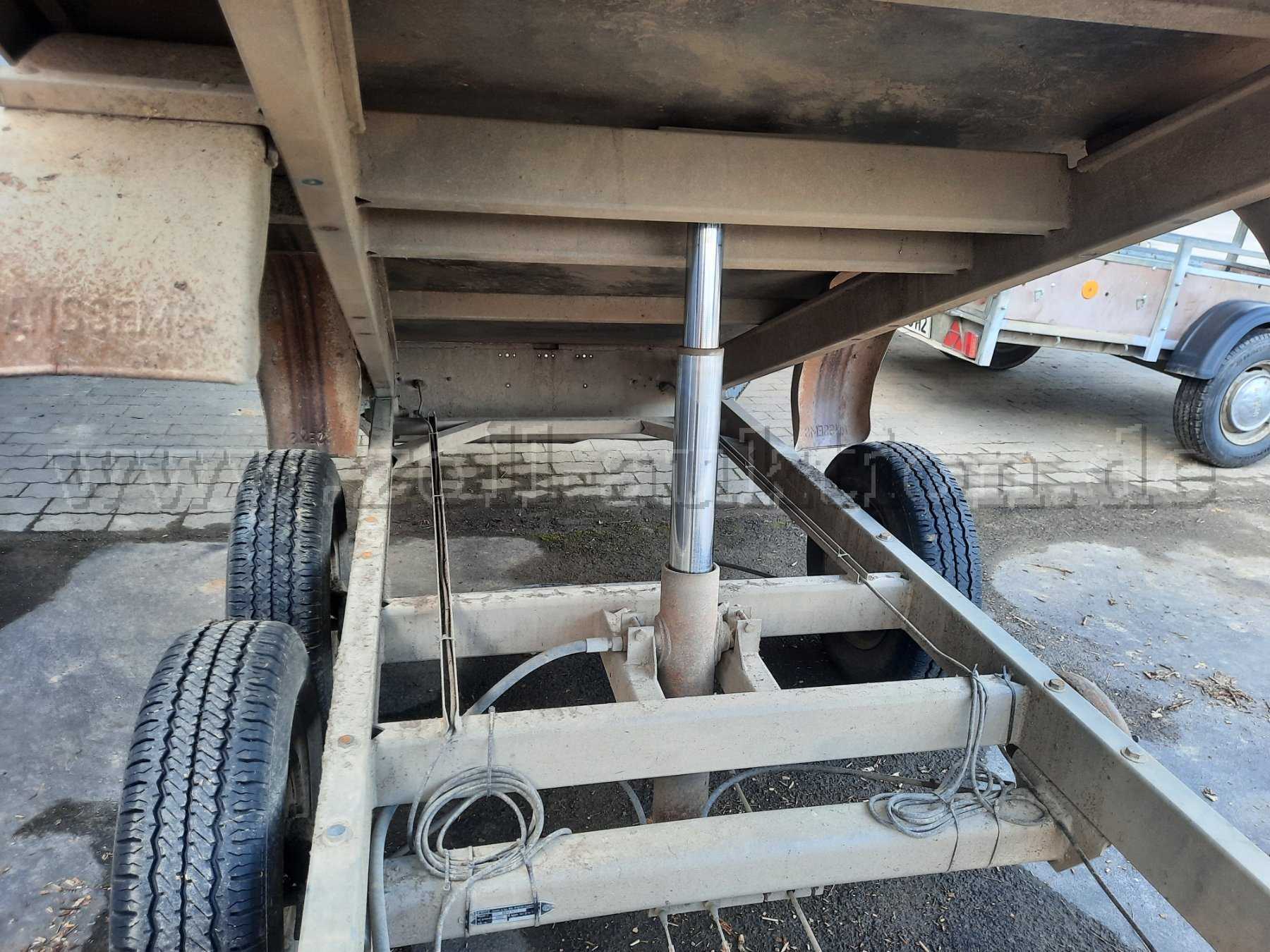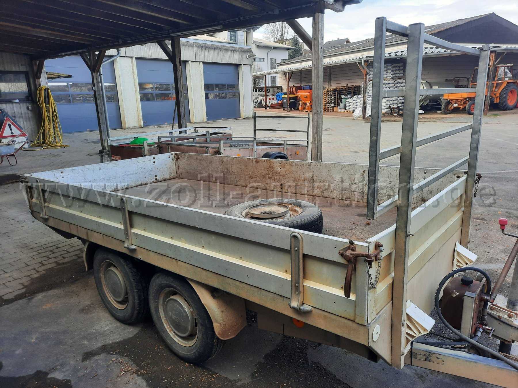 Der Rückwertskipper wurde auf dem Bauhof der Gemeinde Hüttenberg zum Transport von Grünschnitt eingesetzt. Er befindet sich technisch in einem nicht einsatzbereiten Zustand da bei der Vorderen Achse die Gummilager defekt sind. Die Achsen sind von der Firma Peitz welche leider nicht mehr existiert. Da an einem Tandem Anhänger 2 Achsen vom Gleichen Hersteller verbaut werden müssen, benötigt man für die Instandsetzung zwei neue Achsen eines anderen Herstellers. Alters bedingt hat der Anhänger ein paar Beulen und Roststelle, Ansonsten ist der Anhänger in Ordnung.