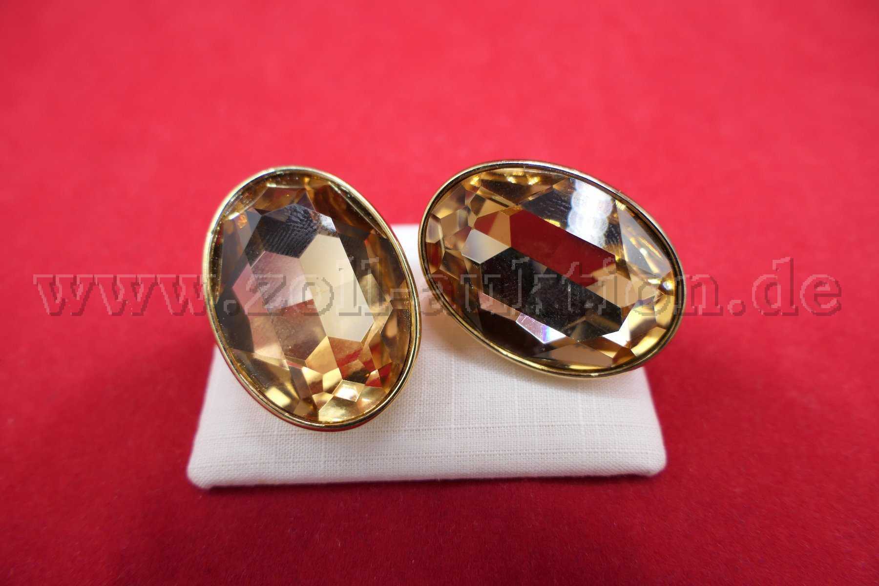 Versteigert wird ein Paar Ohrclips mit gelben Glassteinen mit einem Maß von 23x32 mm.