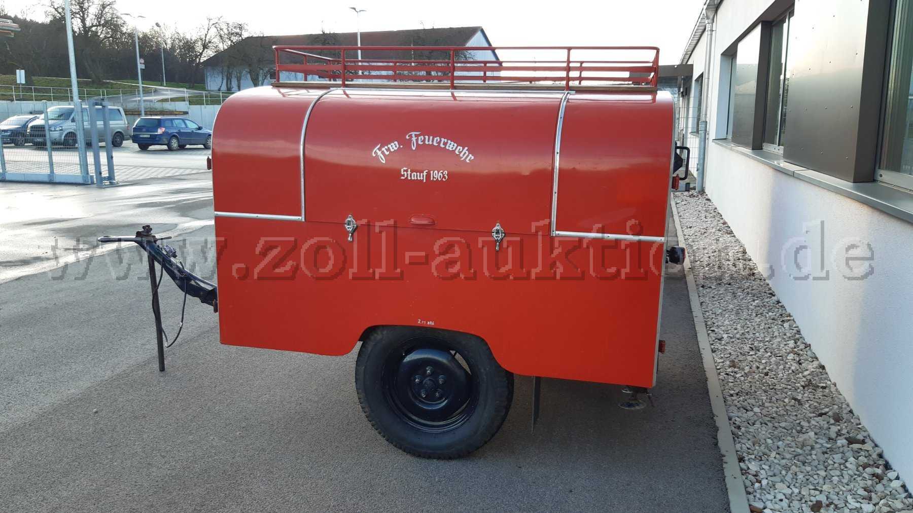Bei dem angebotenen Anhänger handelt es sich um einen historischen Feuerwehranhänger aus dem Jahr 1963. Der Anhänger hat eine Feststellbremse und ist mit feuerwehrspezifischen Ein- und Umbauten ausgestattet, er wird ohne jegliche Beladung versteigert. An den hinteren Stützen sind Roststellen vorhanden. Der Anhänger ist funktionsfähig und Fahrbereit. Es wird empfohlen, den Anhänger zuvor zu besichtigen. Der Versteigerer behält sich vor, den Schriftzug auf dem Anhänger vor Abholung zu entfernen.