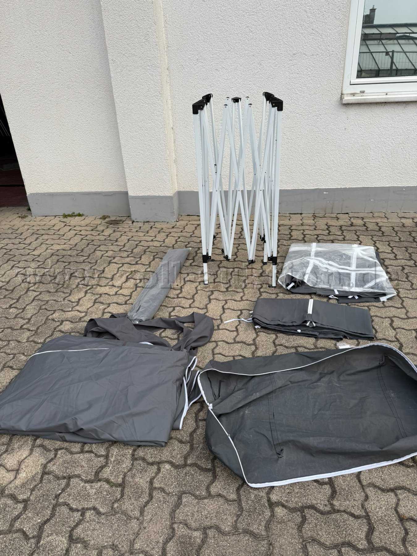 Angeboten wird ein Falt-Pavillon mit drei Seitenwänden, Aufbewahrungstasche und Abspannseilen. Zerlegbar und leicht transportabel.