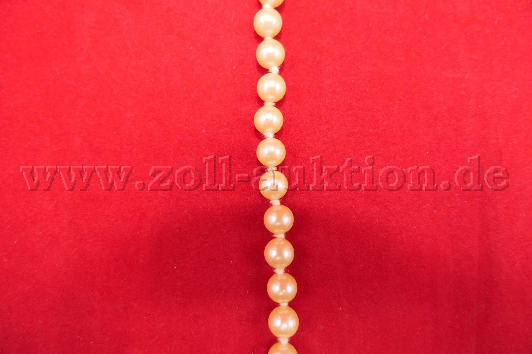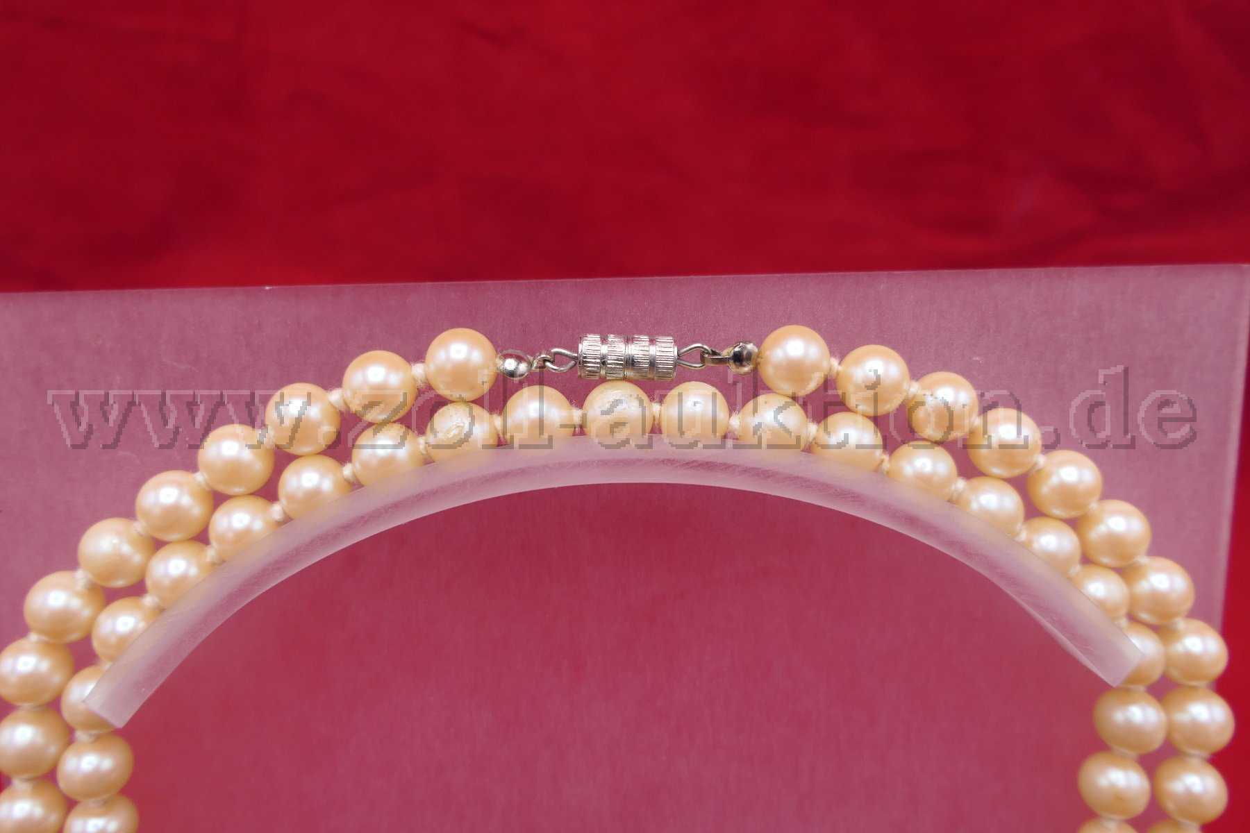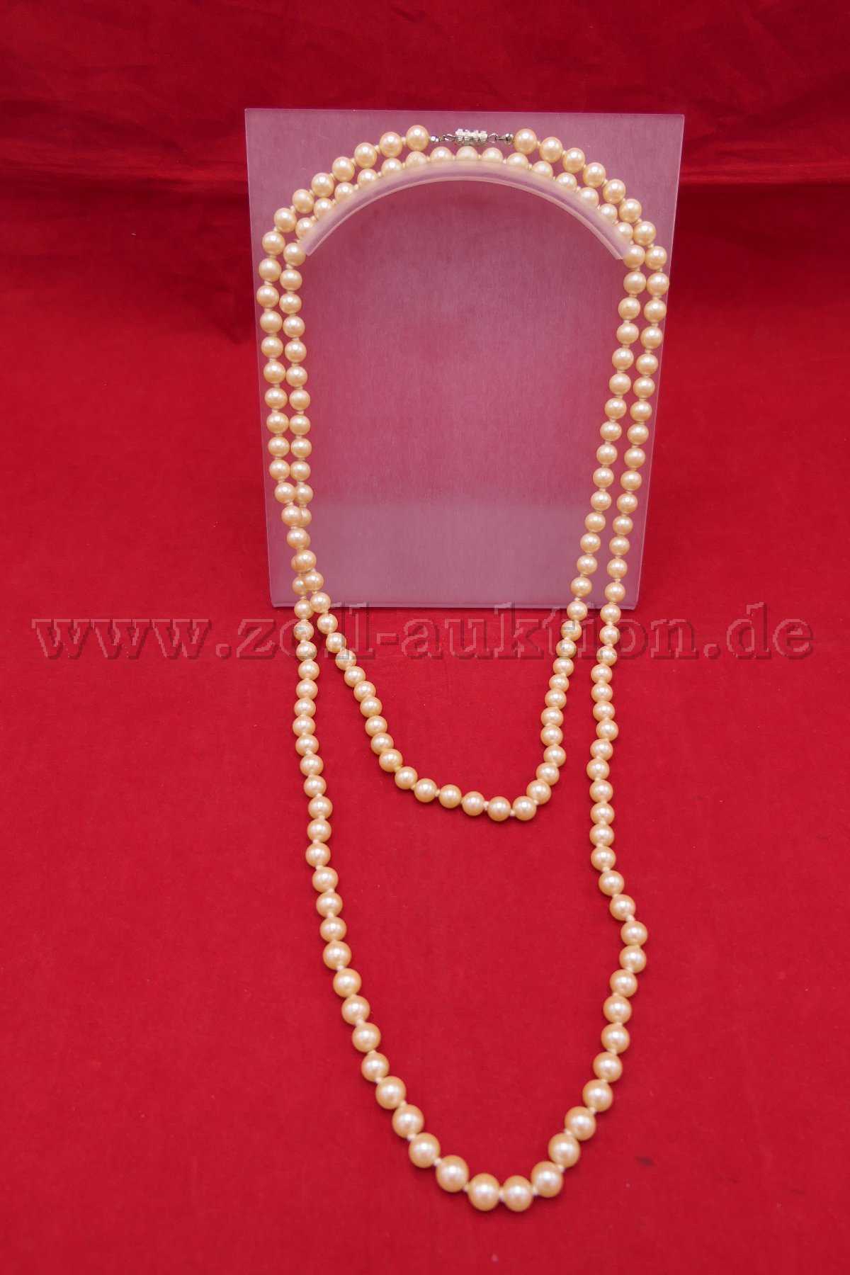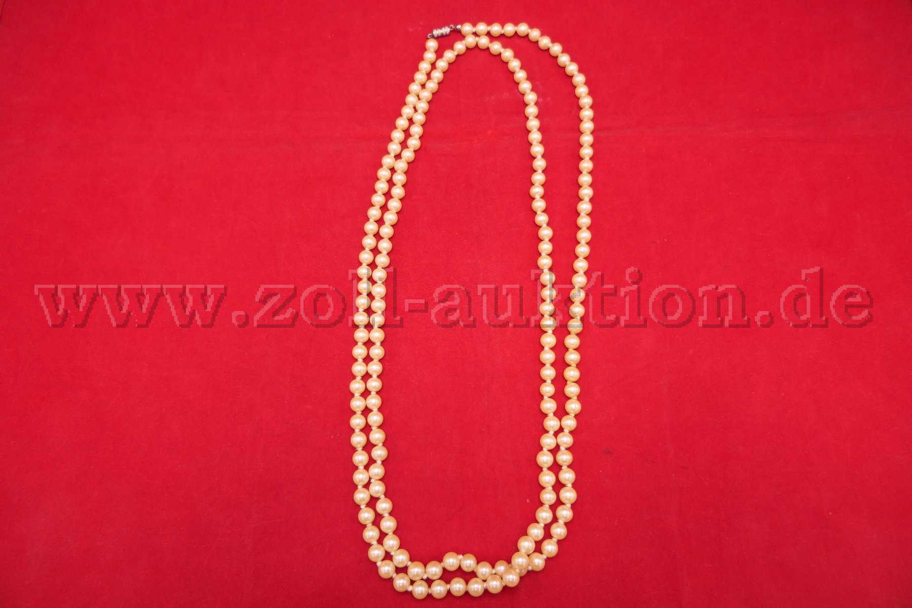 Versteigert wird eine gelbliche Perlenkette (synthetische Perlen) mit Schloss.