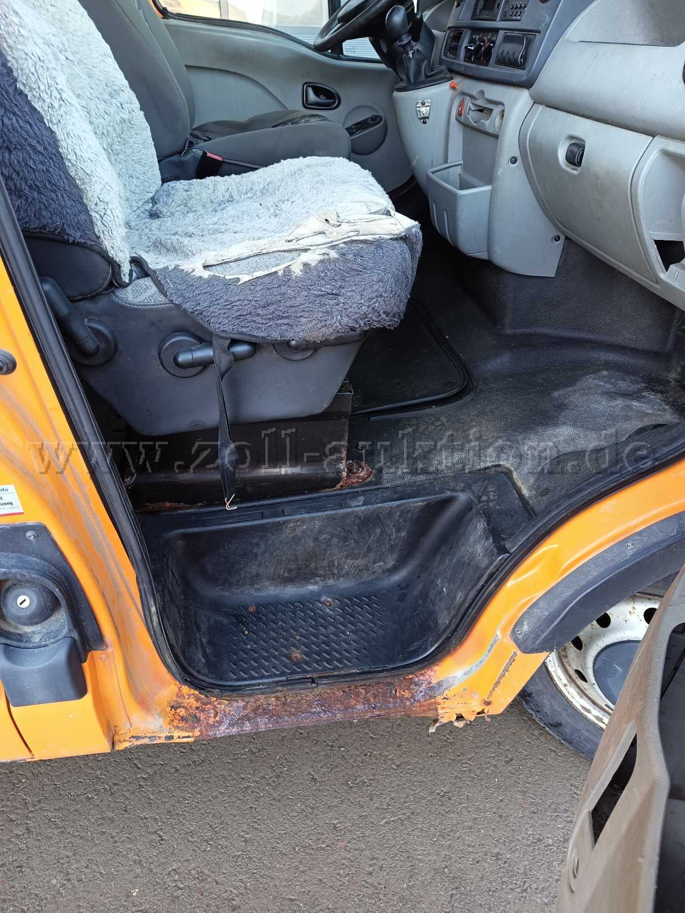 Der Fahrzeuginnenraum ist stark abgenutzt. Die Innenverkleidung ist teilweise gebrochen und hat Fehlteile.