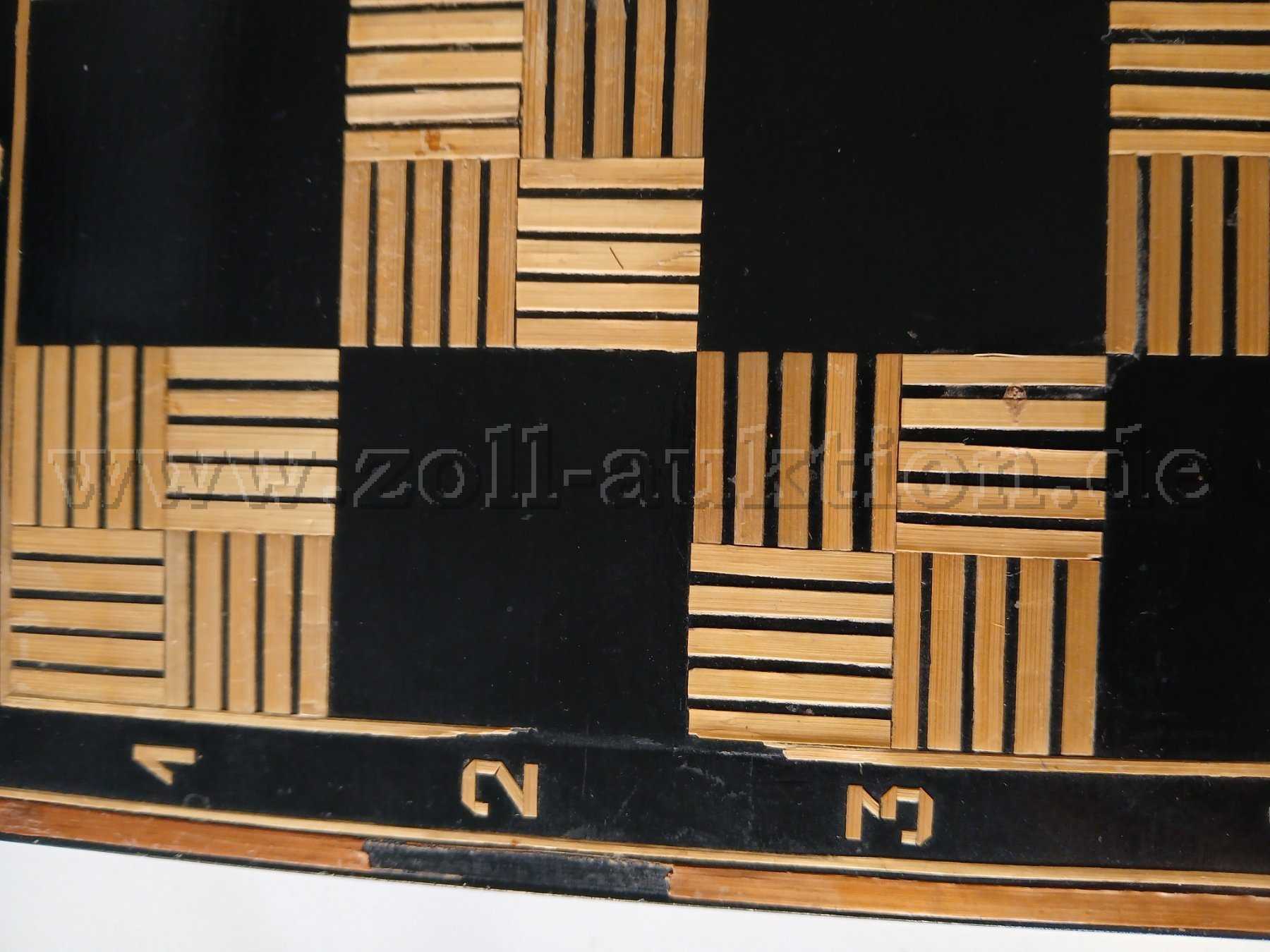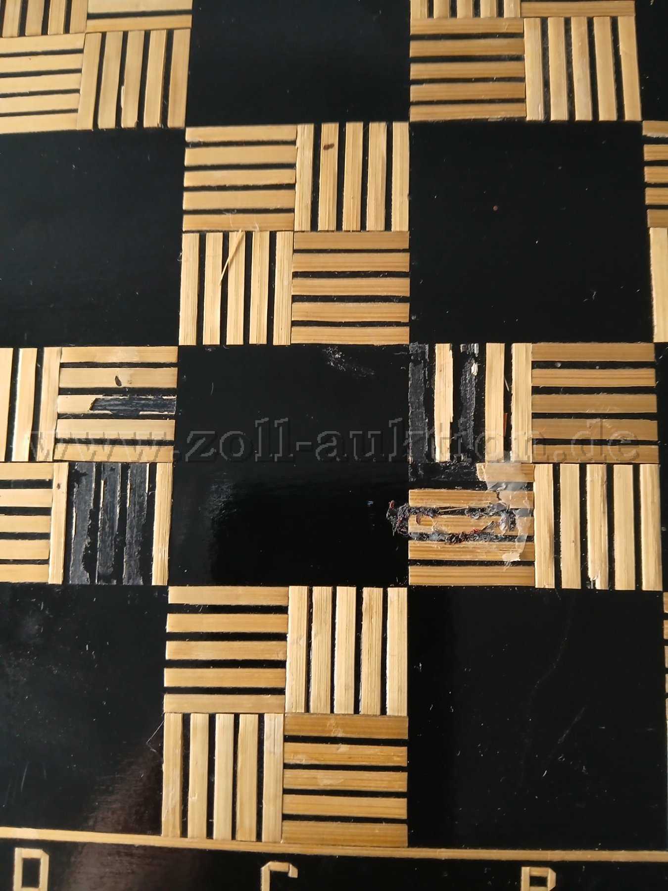 Zwei abgeplatzte Felder an der Oberfläche, Ablösung von Holzapplikationen (siehe Fotos).