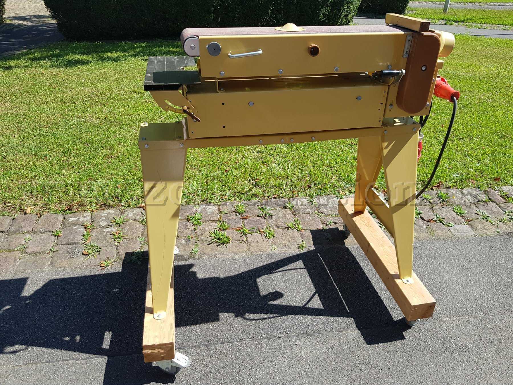 Zustand: Die Bandschleifmaschine sowie die Arbeitsplatten vorne und rechts weisen leichte Gebrauchsspuren auf, die aber die Funktion nicht beeinträchtigen. Die Holzunterkonstruktion ist in einem sehr guten Zustand, das Holz ist trocken und nicht morsch. Der Lack an einem der hinteren Tischbeine ist verkratzt. Ansonsten ist die Lackierung in einem sehr guten Zustand. Der Starkstromanschluss befindet sich auf der linken Seite und ist ebenfalls in einem guten Zustand. CE-Kennzeichen nicht ersichtlich.