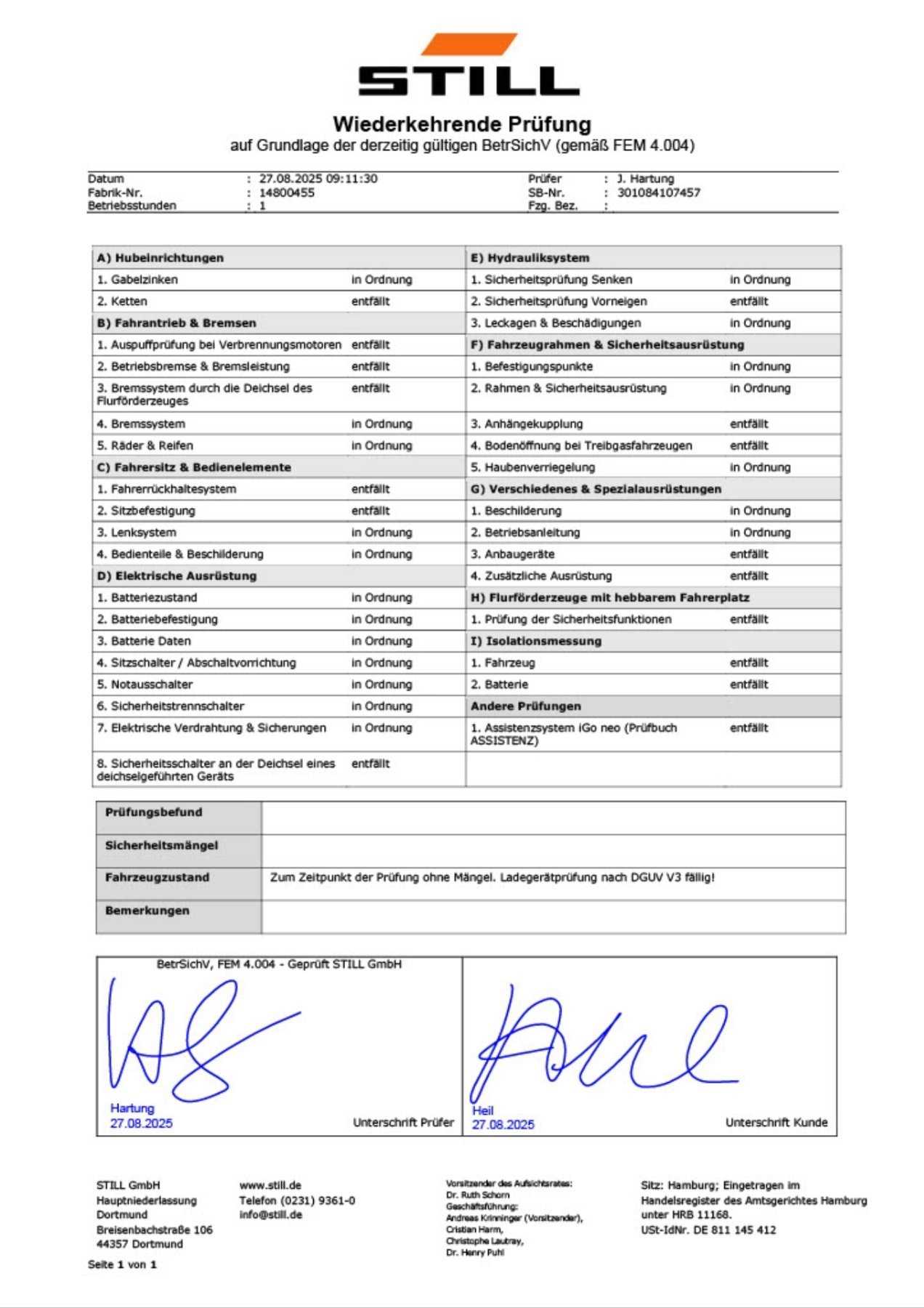- jährliche Prüfung/Instandhaltung durch Fachfirma (siehe Protokoll)