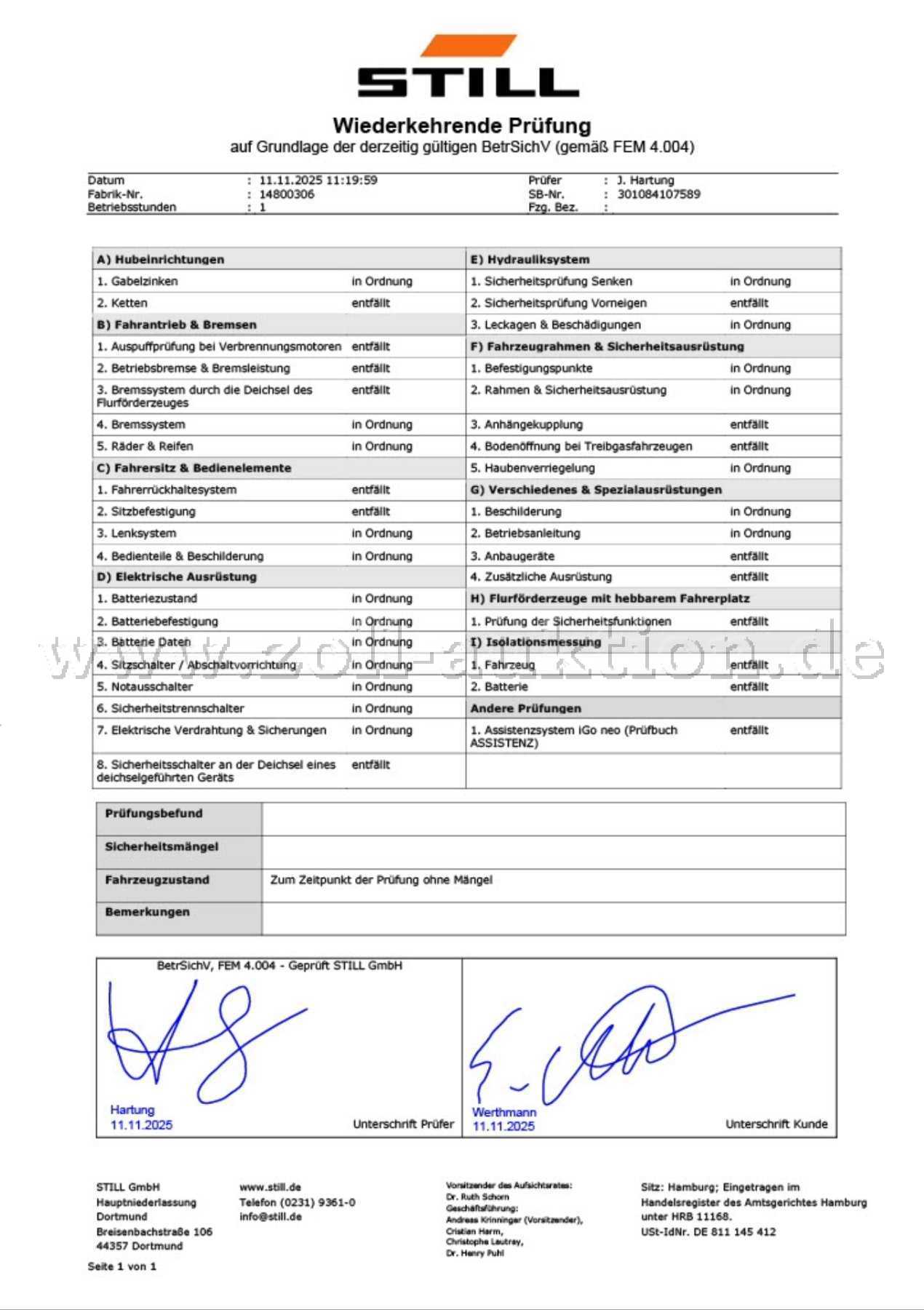 - jährliche Prüfung / Instandhaltung durch Fachfirma (siehe Protokoll)