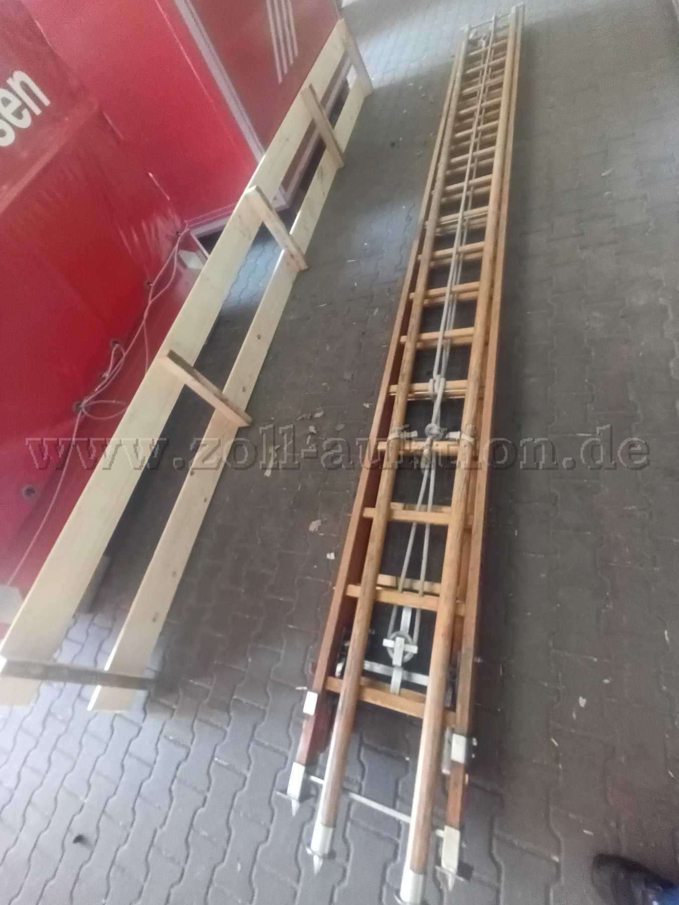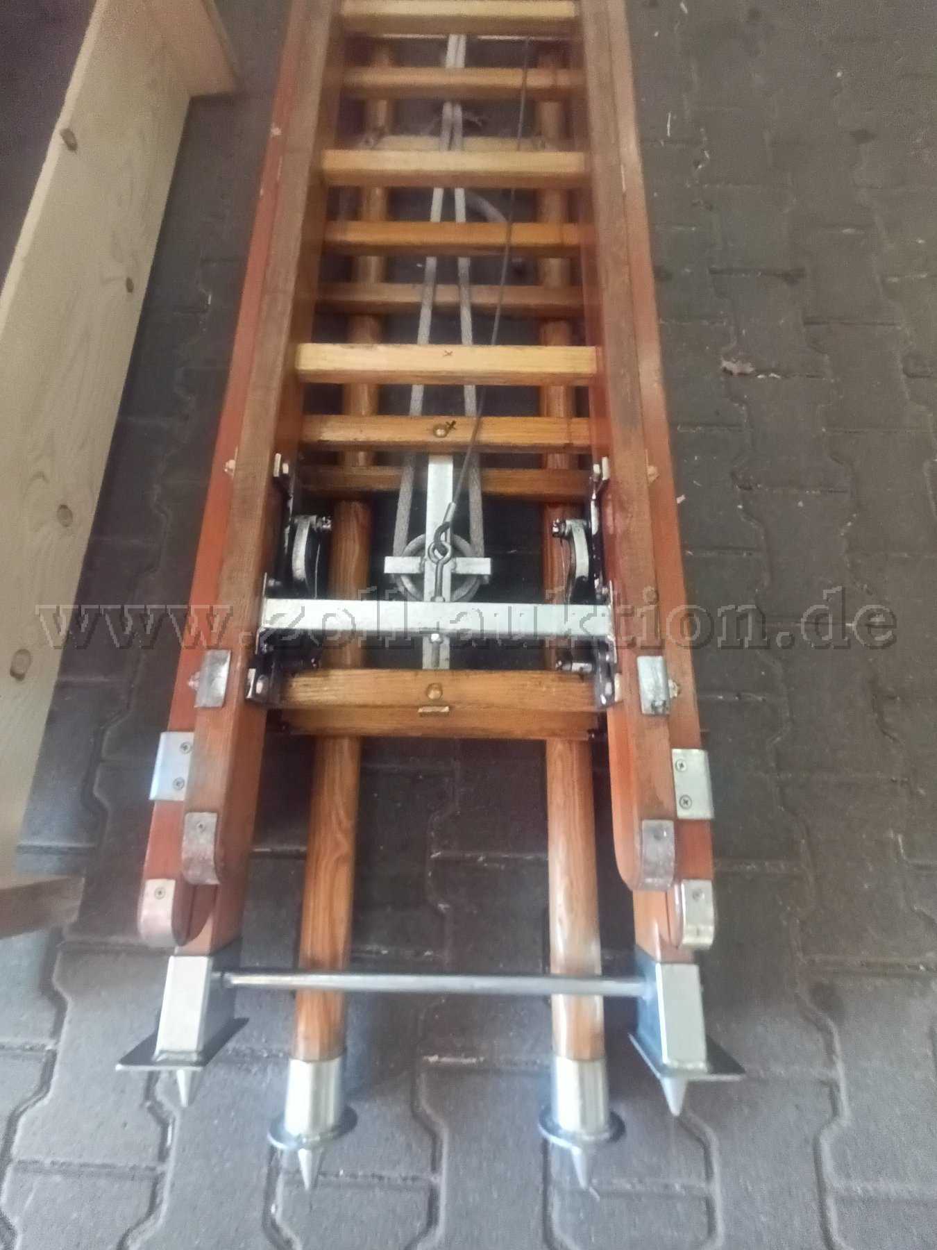 Artikelzustand: Die Holz- Schiebeleiter der Feuerwehr befindet sich in einem gebrauchten Zustand und weist die normalen Gebrauchs- und Abnutzungsspuren (leichte Kratzer, Lackabplatzer und Verschmutzungen) auf.