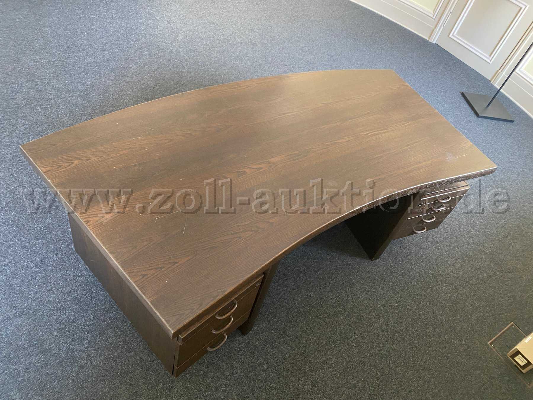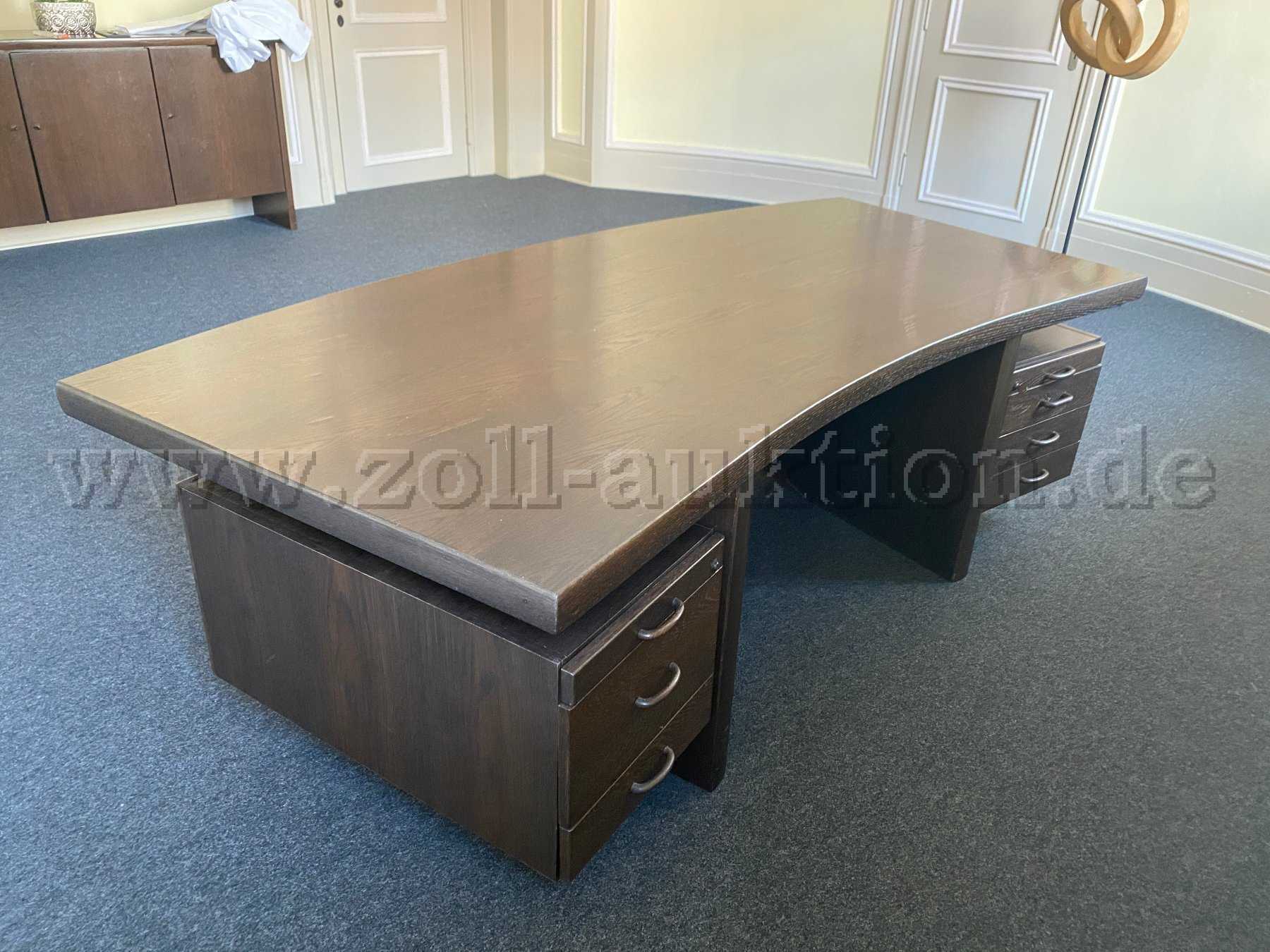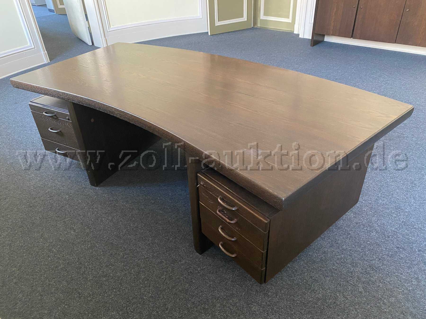 Zur Versteigerung steht ein Schreibtisch aus massivem Mooreichenholz in dunkelbrauner Ausführung.