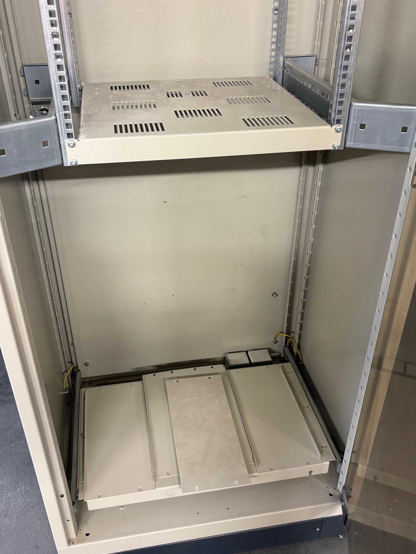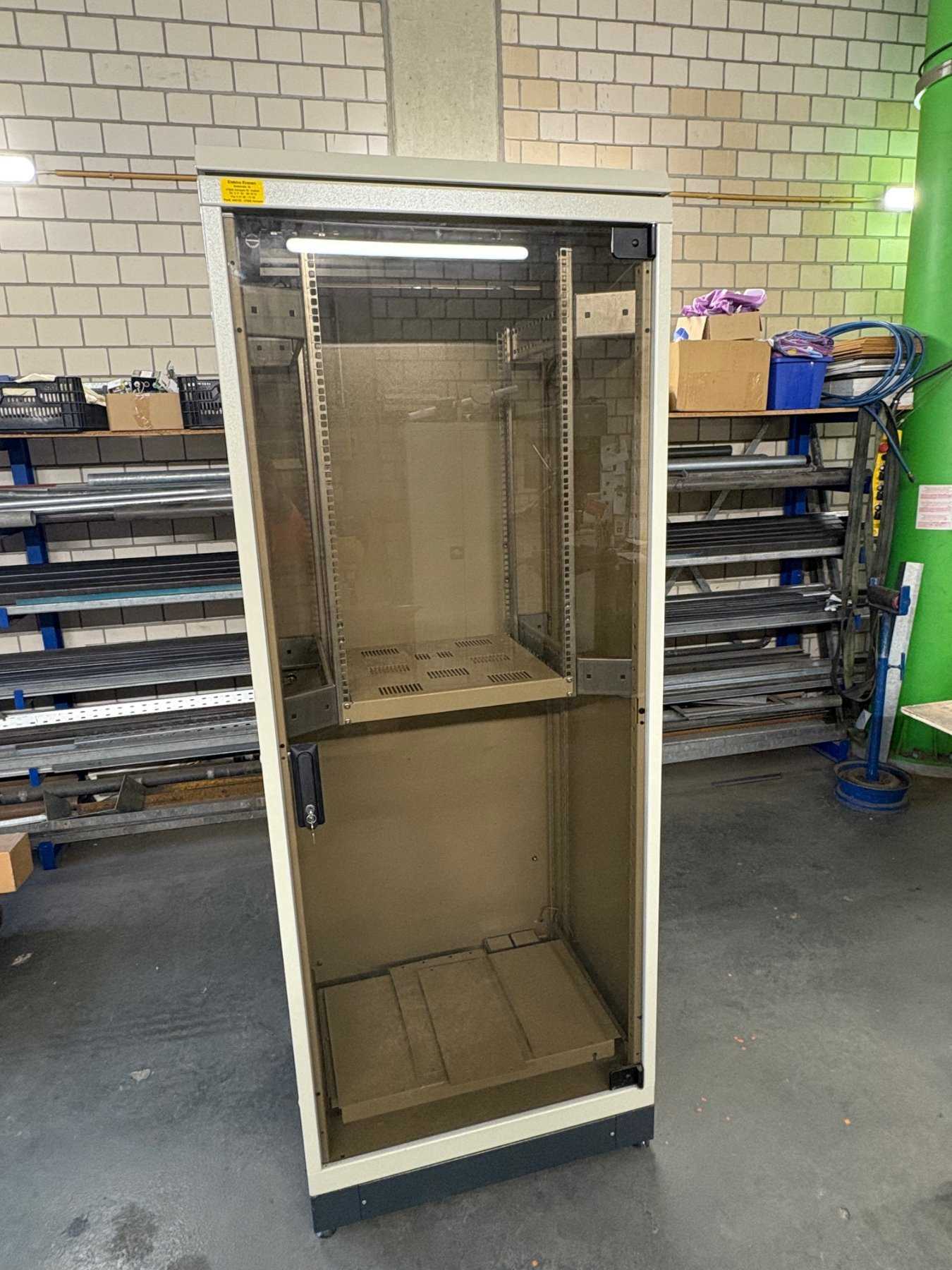 Zubehör: Bitte beachten Sie: Der Schrank wird versteigert, wie er auf den Fotos zu sehen ist, ohne jegliches internes Zubehör (z.B. Server, Patchkabel, Einlegeböden, Lüfter).