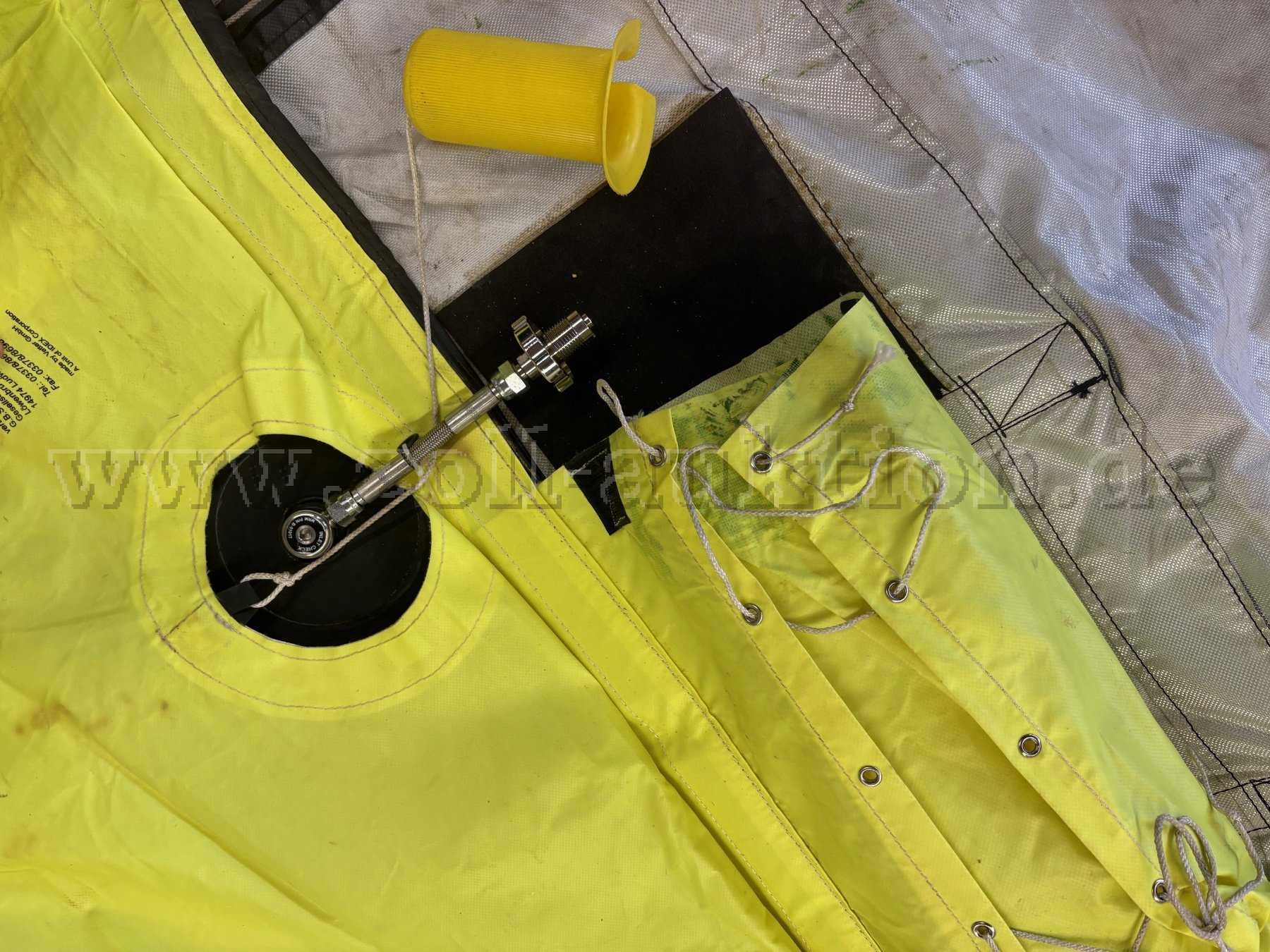 Der Sprungretter wird ohne die für den Betrieb benötigte Druckluftflasche, aber mit Tragesack, Bedienungsanleitung und Prüfbuch abgegeben.