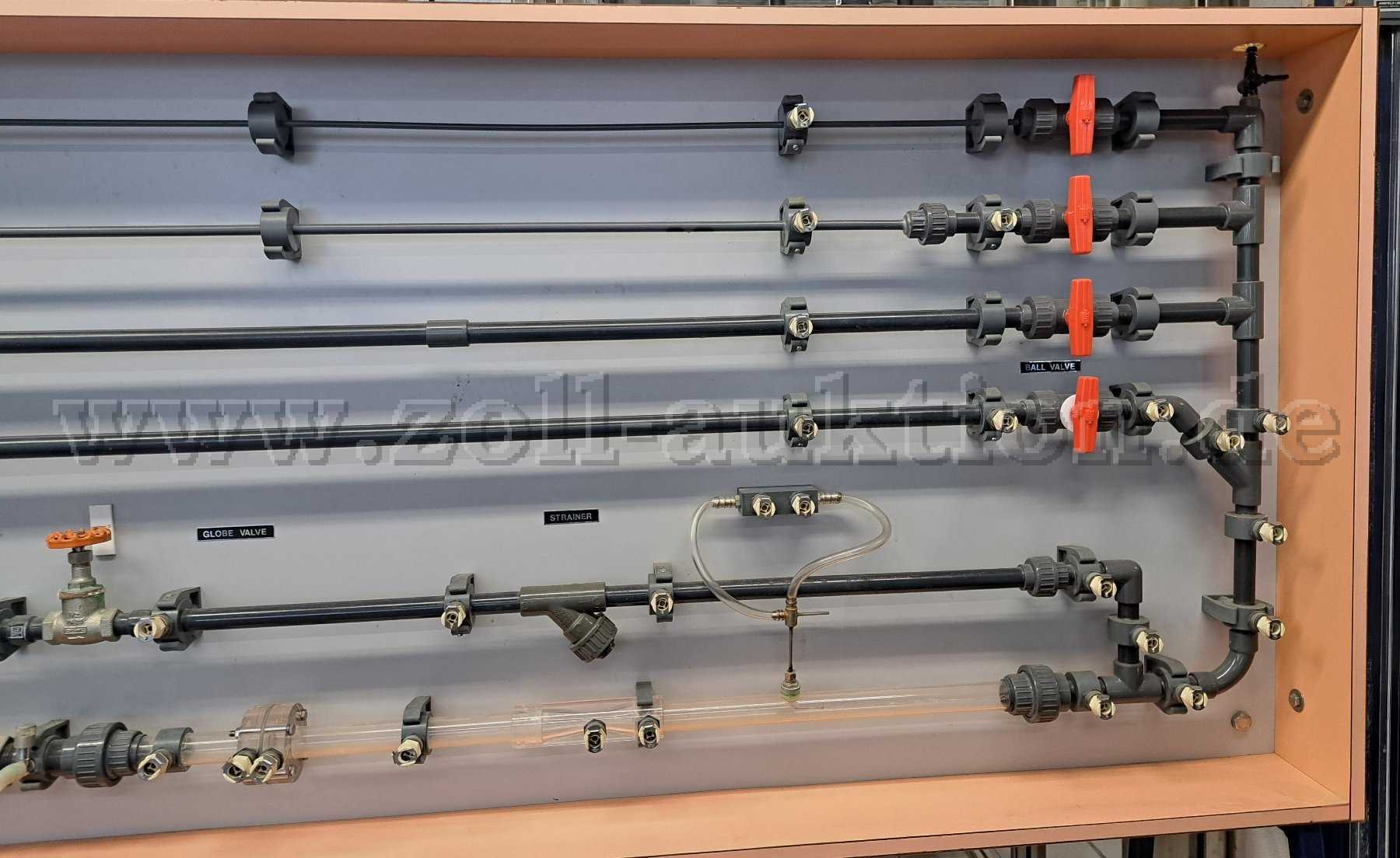 An der Strömungswand können Druckverluste von inkompresiblen Fluiden in Abhängigkeit verschiedener Rohrnennweiten und Einbauten (Bögen, Ventile, etc.) untersucht werden. Hierzu kann in ein Becken Wasser vorgelegt und durch das Leitungssystem gepumpt werden. Die Pumpe lässt sich aktuell nicht einschalten. Reibungsverluste in geraden Rohren unterschiedlicher Größe können in einem Bereich von Reynolds-Zahlen von 10hoch3 bis 10hoch5 untersucht werden, wodurch laminare, Übergangs- und turbulente Strömungen in den Experimenten enthalten sind.