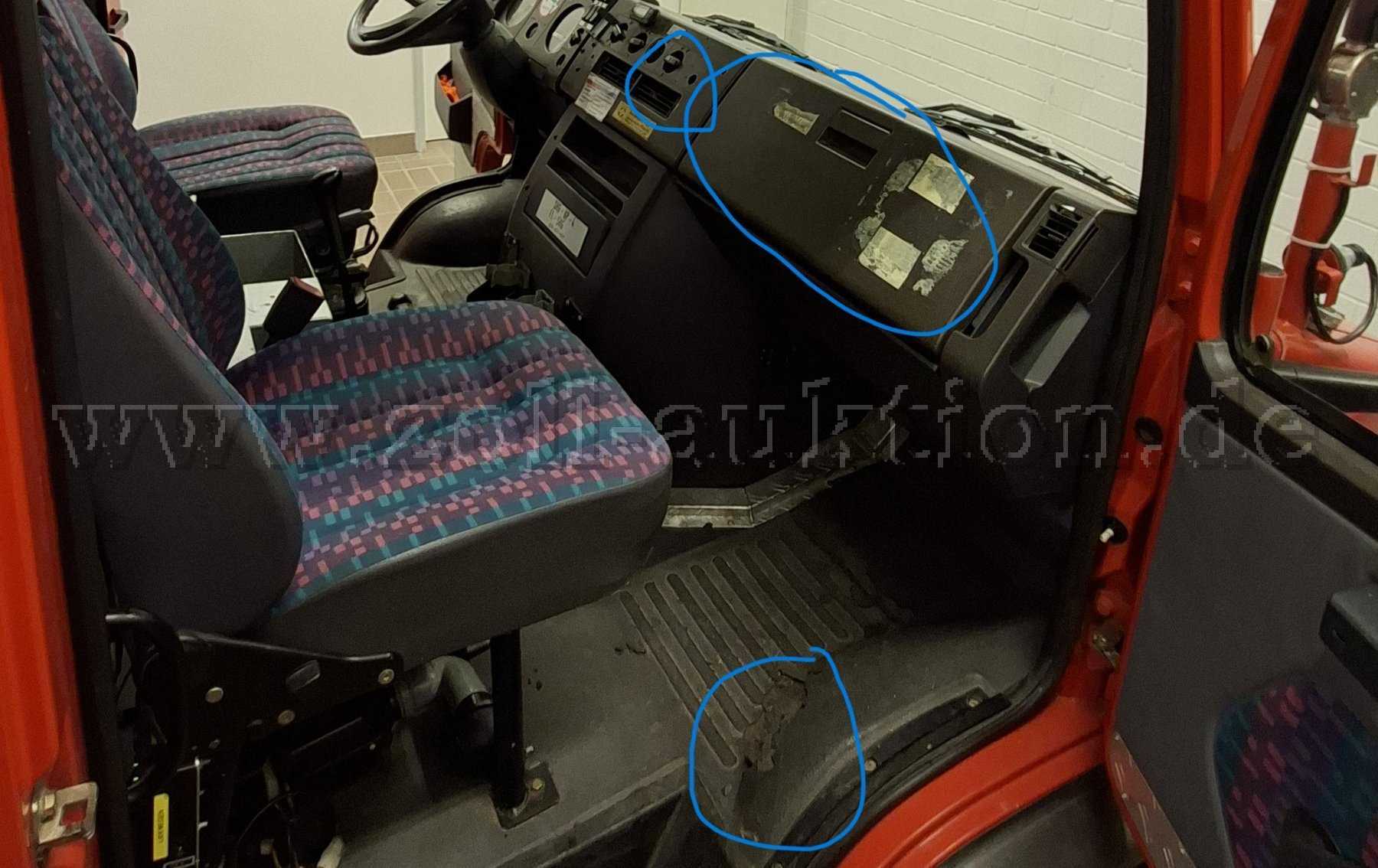 - Alters- und nutzungsbedingte Gebrauchsspuren: Armaturenbrett hat Löcher von vormals montiertem Funk und anderem Equipment. Der Fußboden in der Fahrerkabine ist verschmutzt, abgenutzt und wie auf den Bildern zu sehen, im Beifahrer-Bereich beschädigt. Außen hat das Fahrzeug einen Hagelschaden. Insgesamt ist der Gesamtzustand wie auf den Bildern zu sehen, ehrlich und sehr gut.