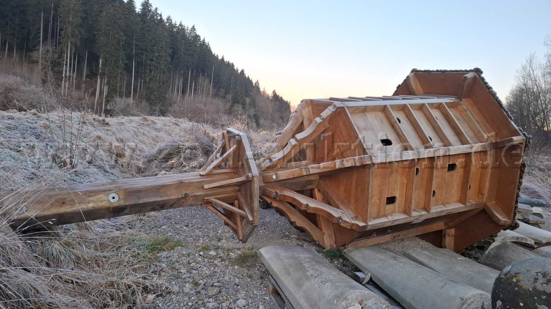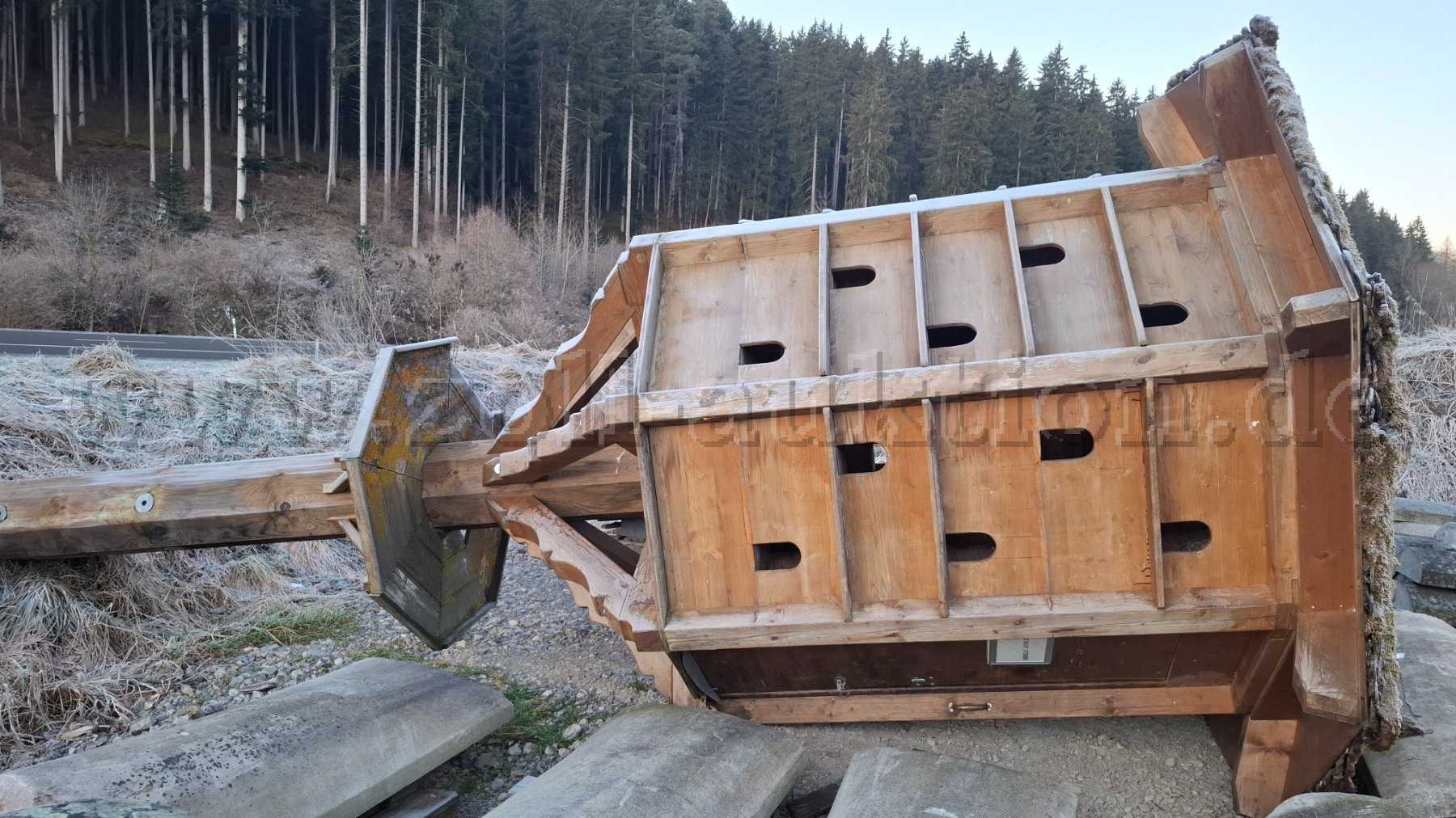 Beim Taubenhaus fehlen ein paar kleinere Holzteile oder müssen neu befestigt werden. Ansonsten ist der Zustand dem alter entsprechend gut. Der Farbanstrich sollte erneuert werden.