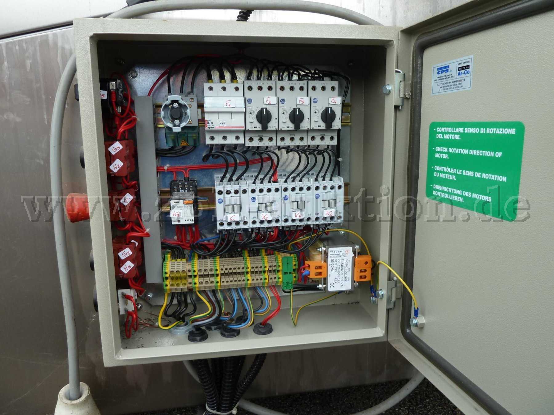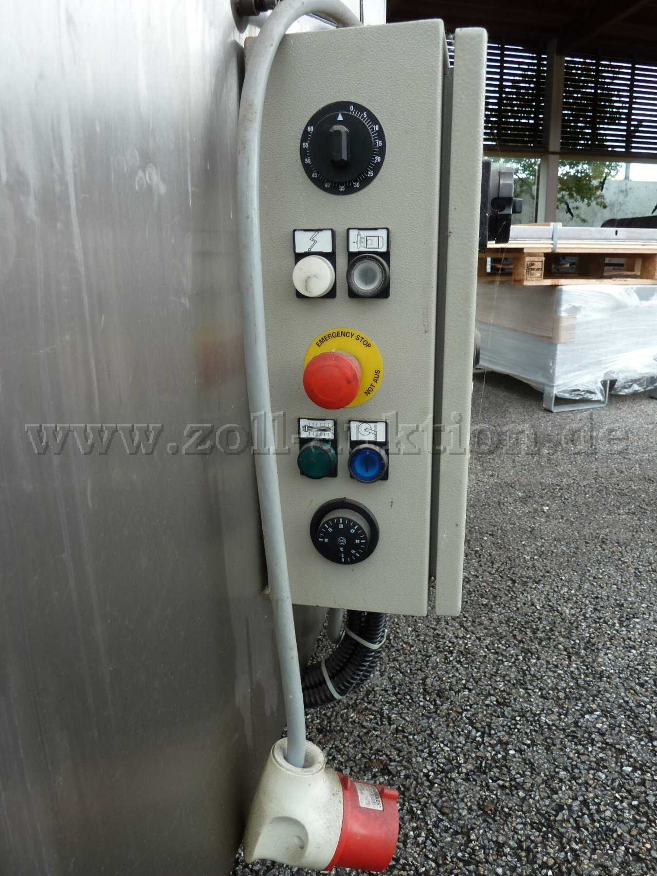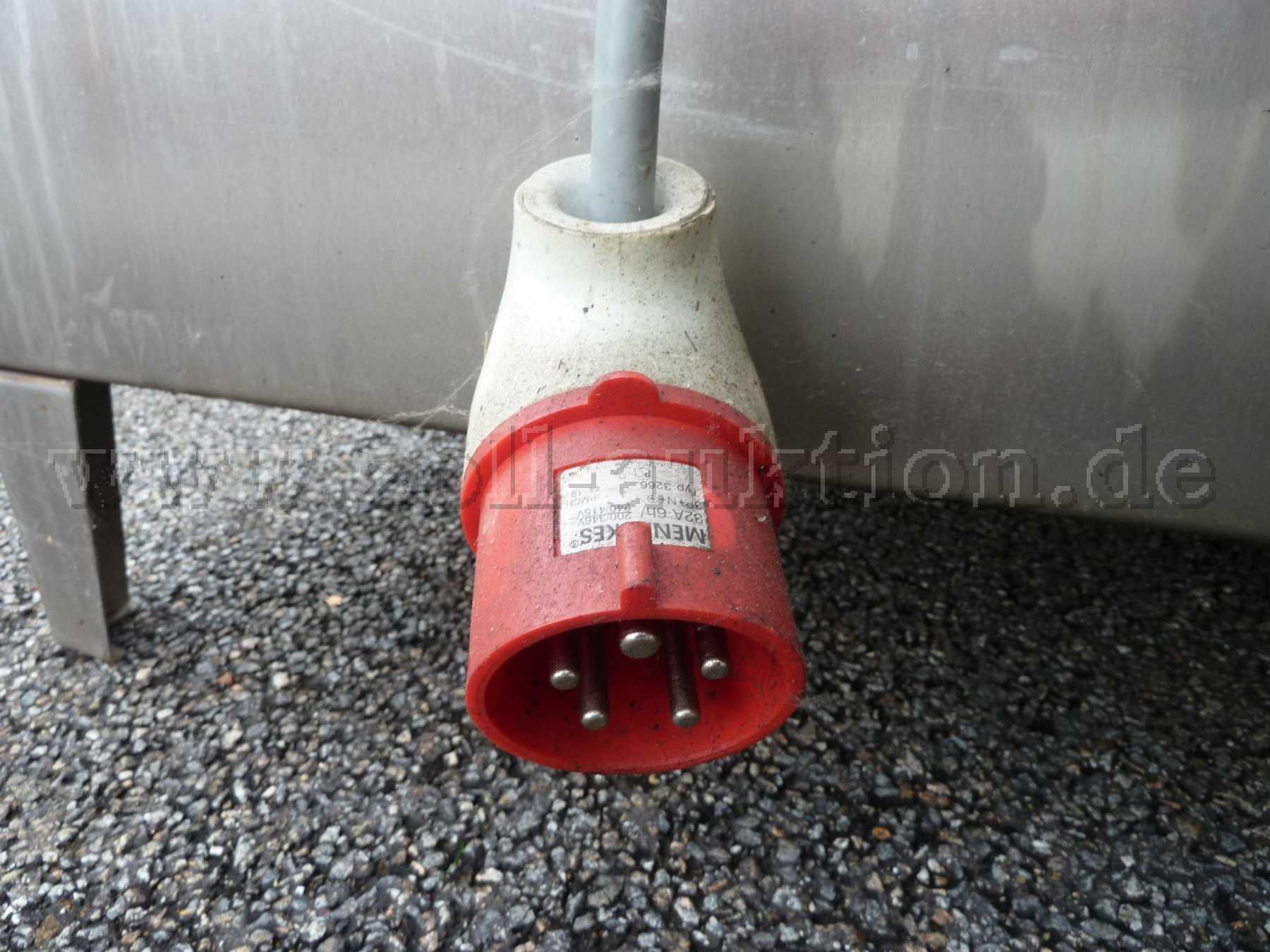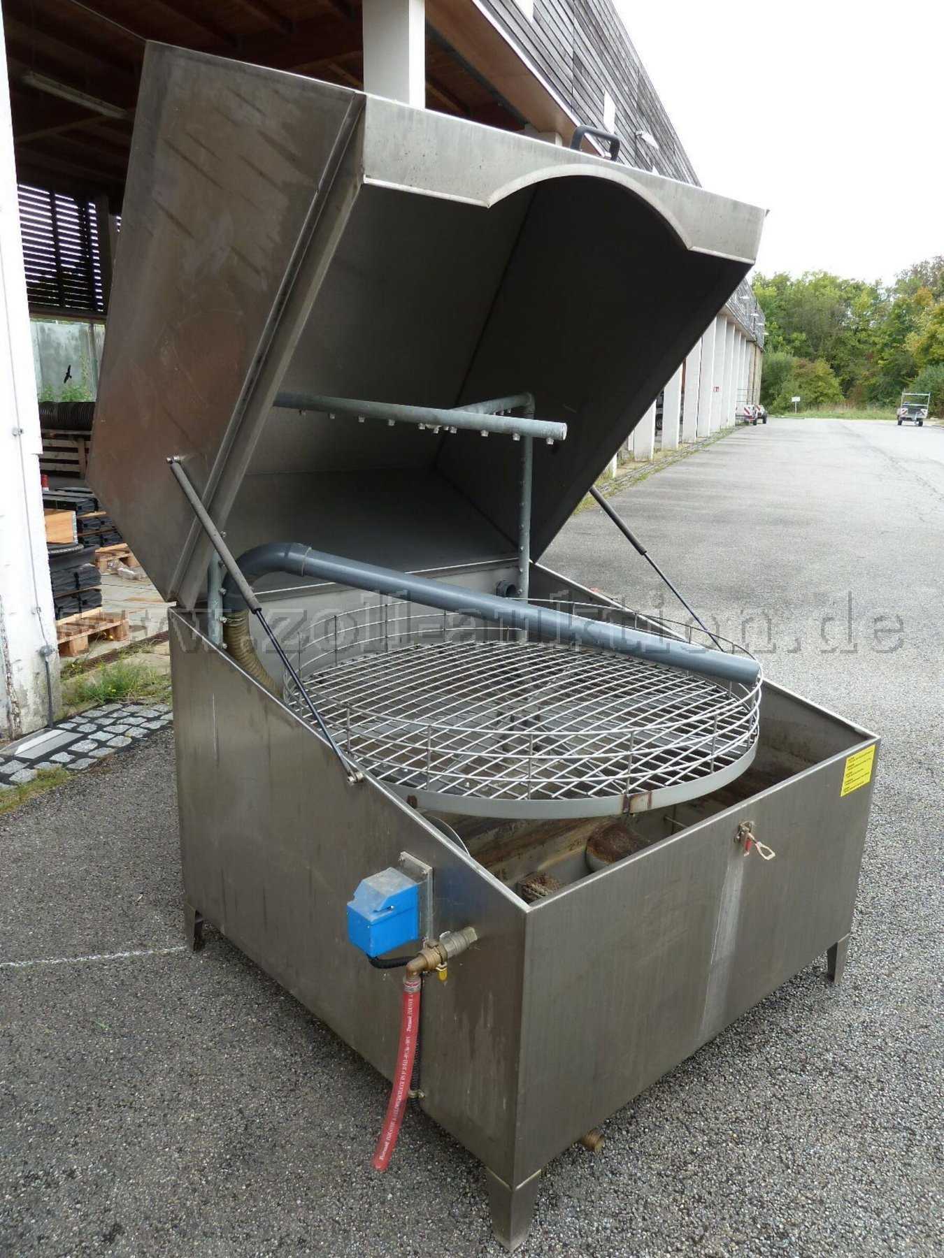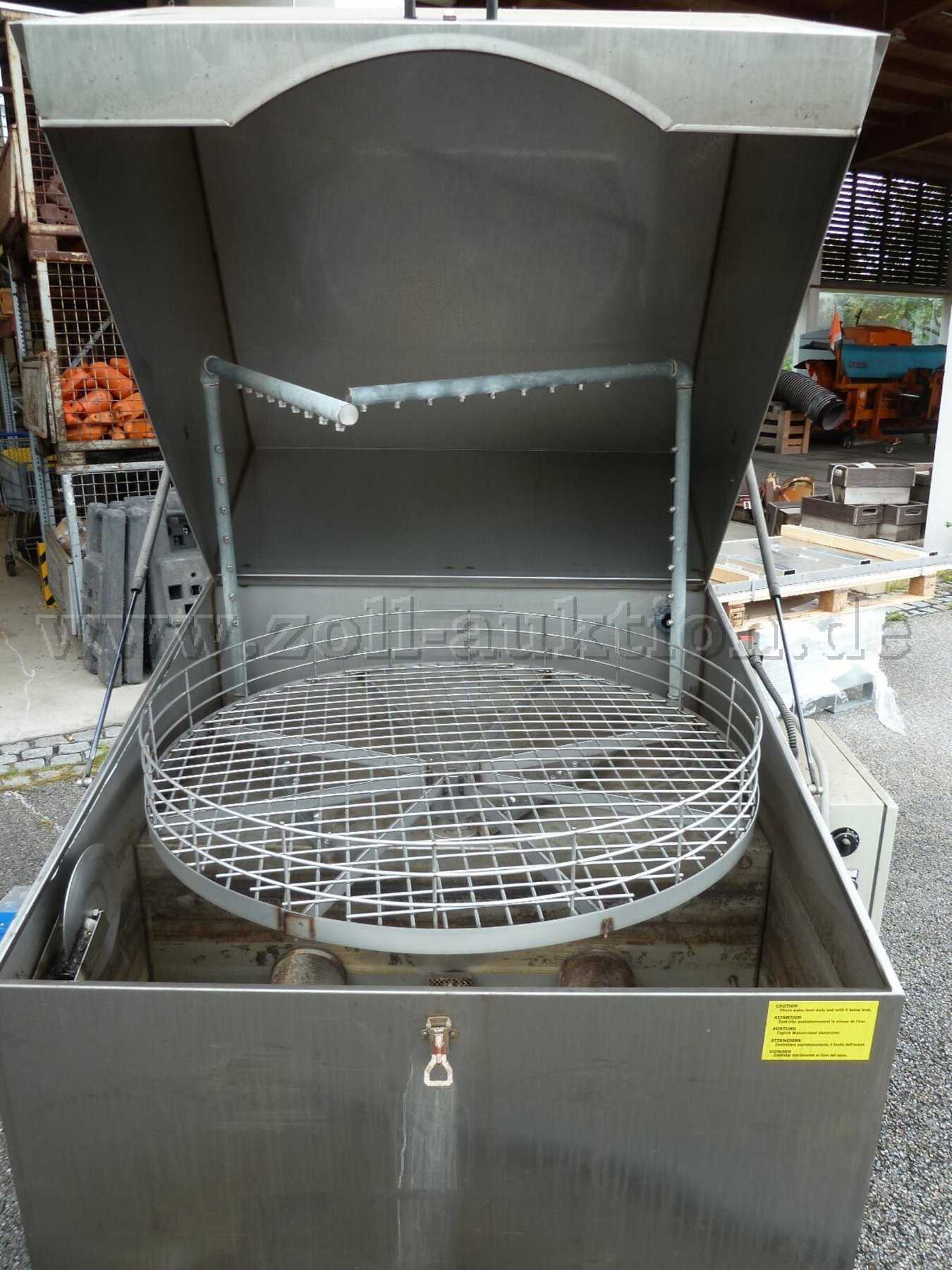 Drehteller zur Teileablage, Ölabscheider, 32A-Anschluss, Bedienteil mit Sicherungskasten, zwei Spritzrohre mit jeweils 16 Düsen, Deckel mit Stoßdämpfern