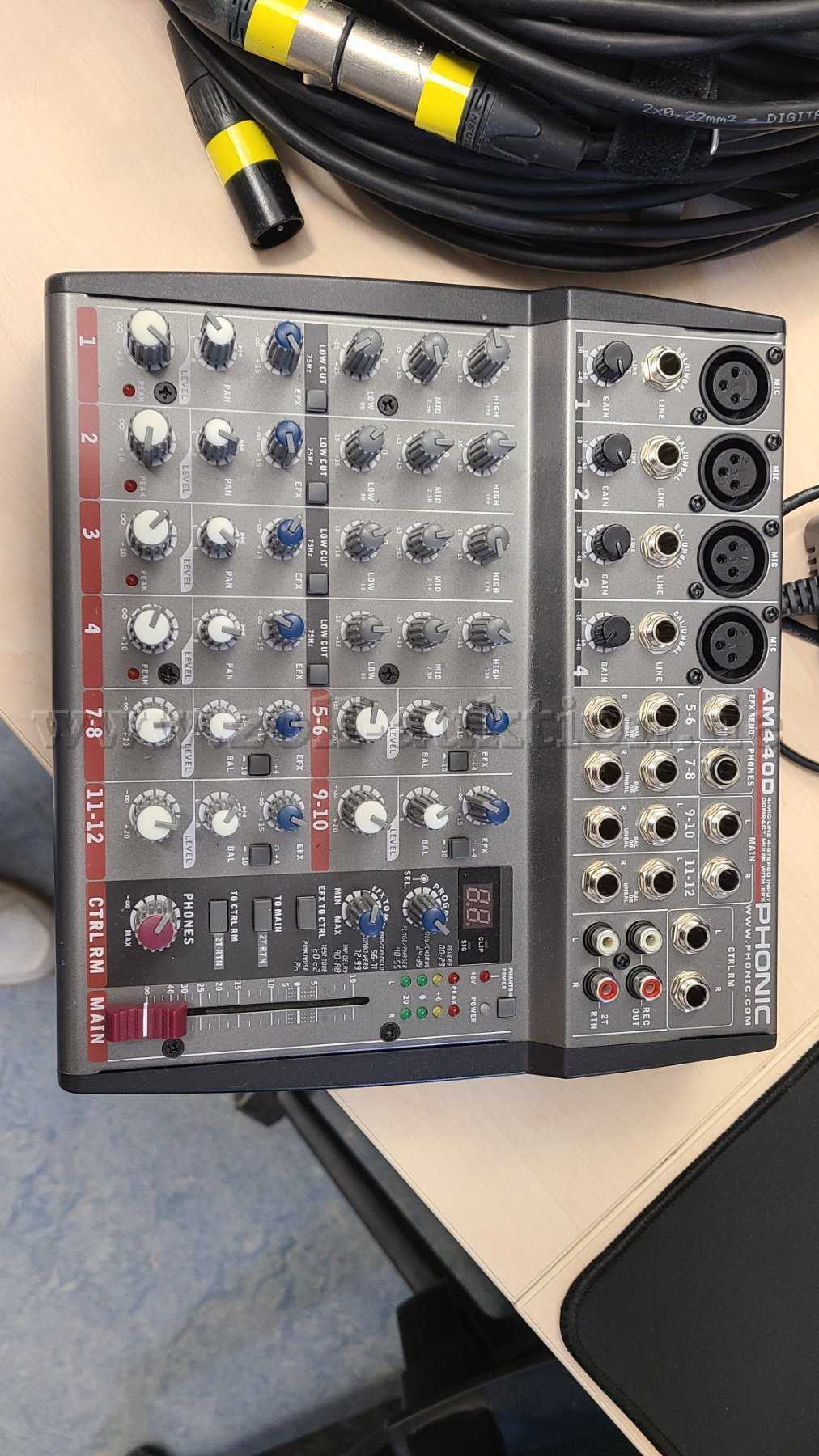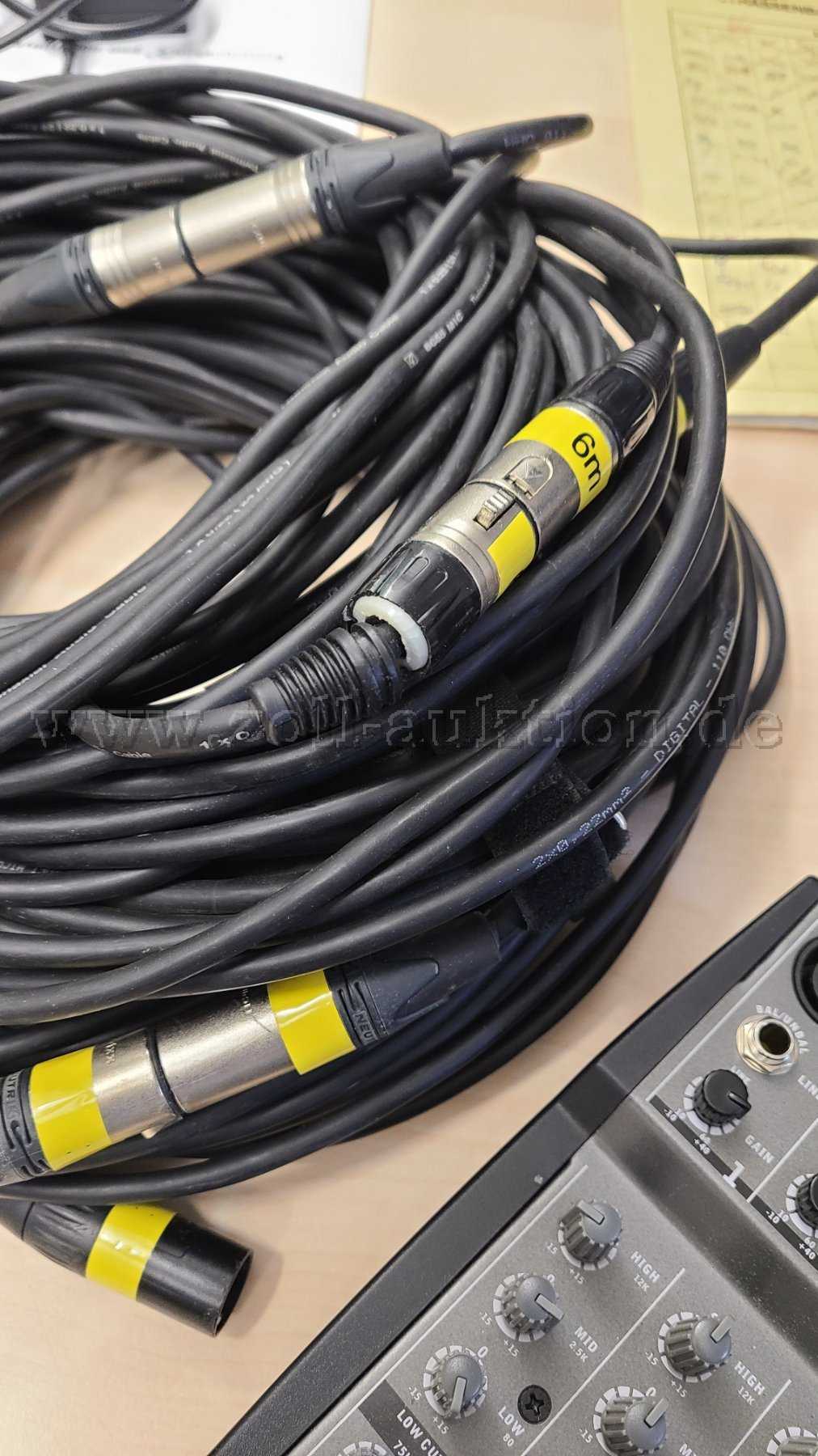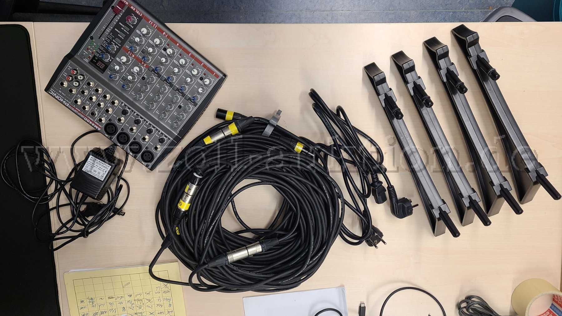 Es handelt sich um 2 Boxen (The Box, PA502A) inklusive Analog-Mixer (Mischpult) AM4400 von Phonic, diverse Kabel, Standfüße und Schutzhüllen.