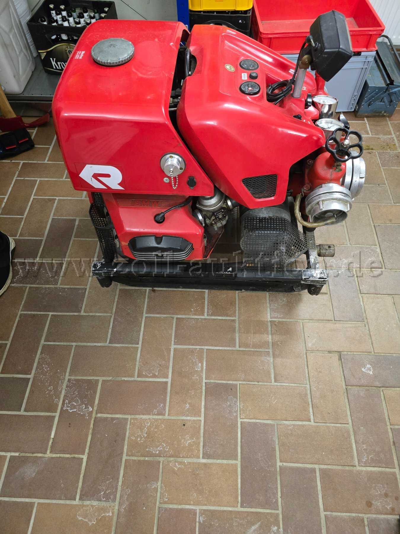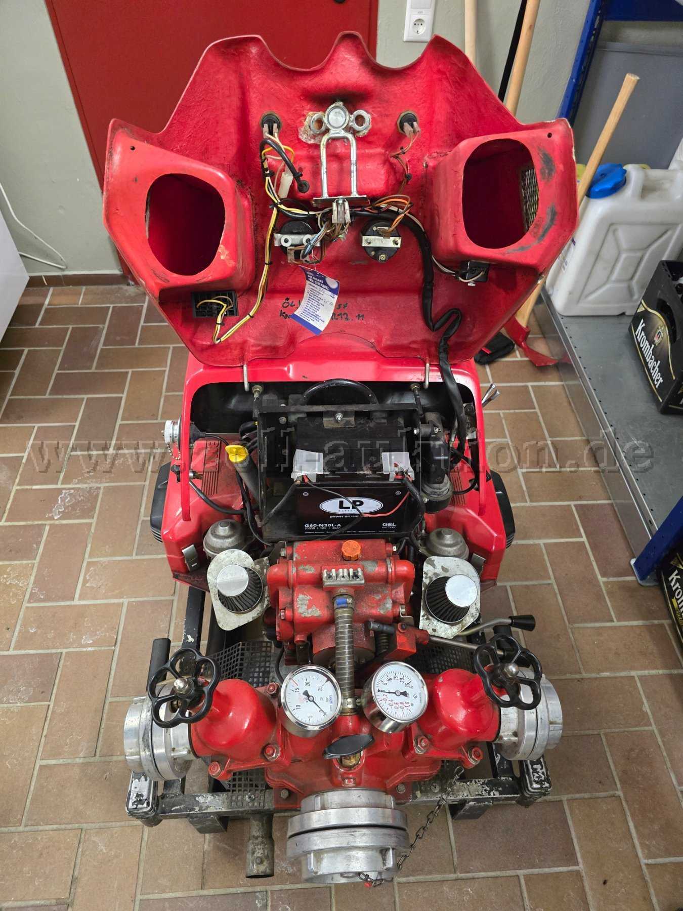 Tragkraftspritze voll funktionsfähig mit dem Alter entsprechenden Gebrauchsspuren, wie Kratzer und Risse im Lack, deutliche Lackabplatzungen am Traggestell, Abnutzungen bei einigen Sicherheitspiktogrammen
