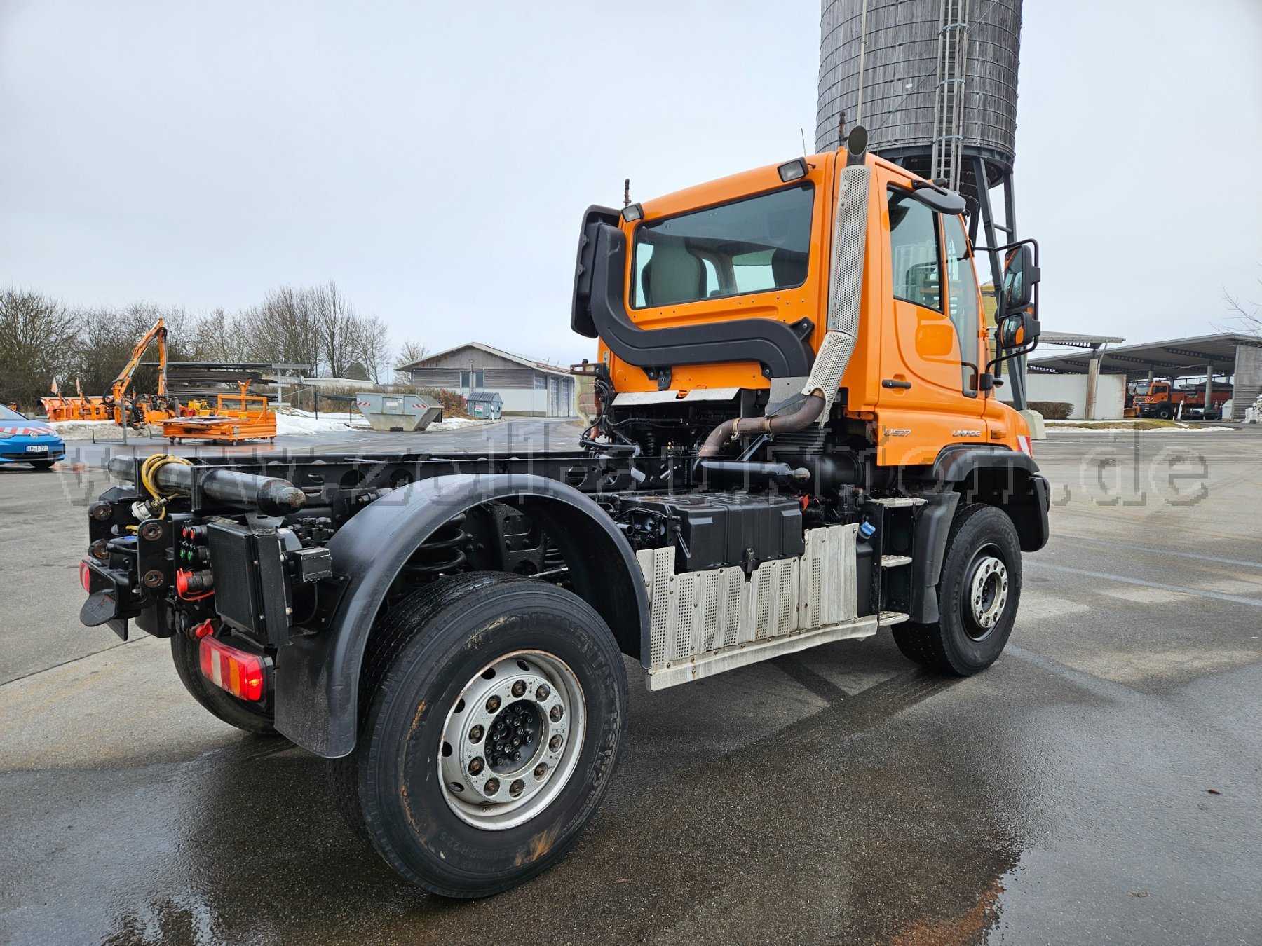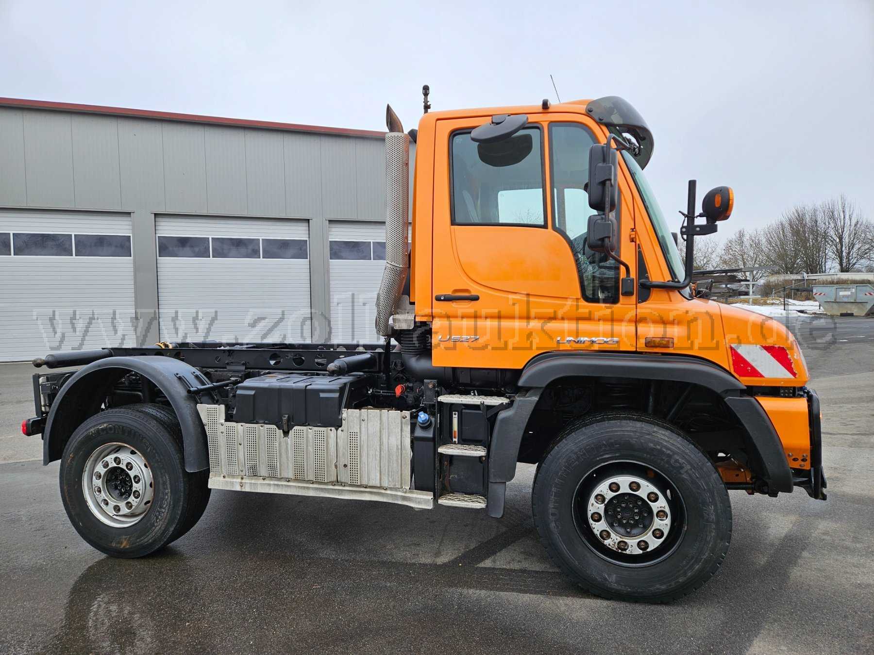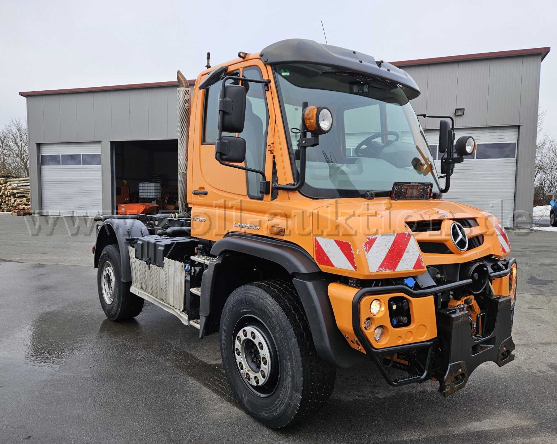 Unimog U527; Grundmodell Unimog mit Kommunalausstattung; Frontanbauplatte; Zusatzhydraulikanlage für Anbaugeräte; Torsionsrahmen; Sonnenblende außen; Anhängerkupplung; Rückfahrkamera; Radio; Hydrostat; Dachantenne; Zapfwelle vorne; Klimaanlage