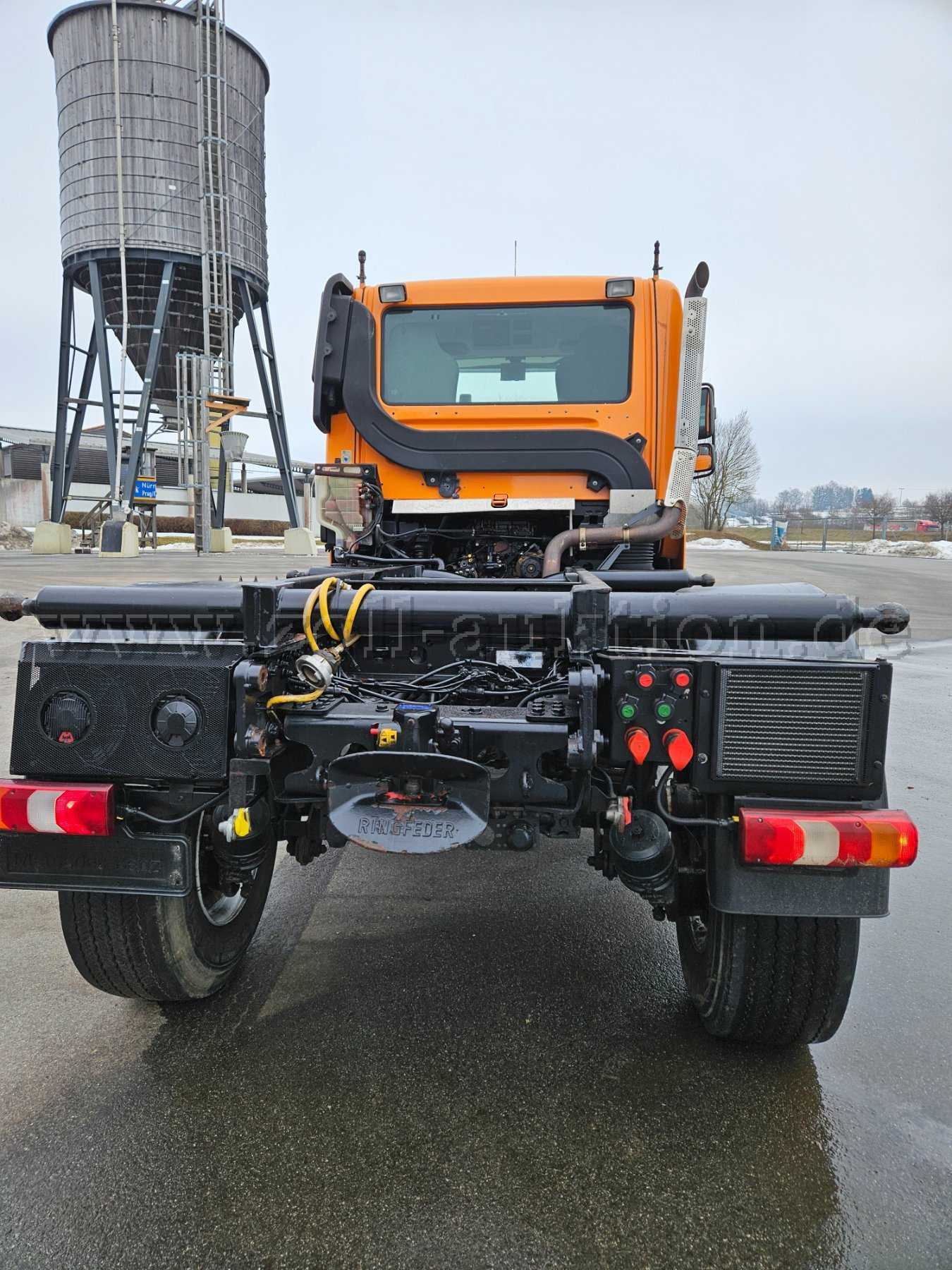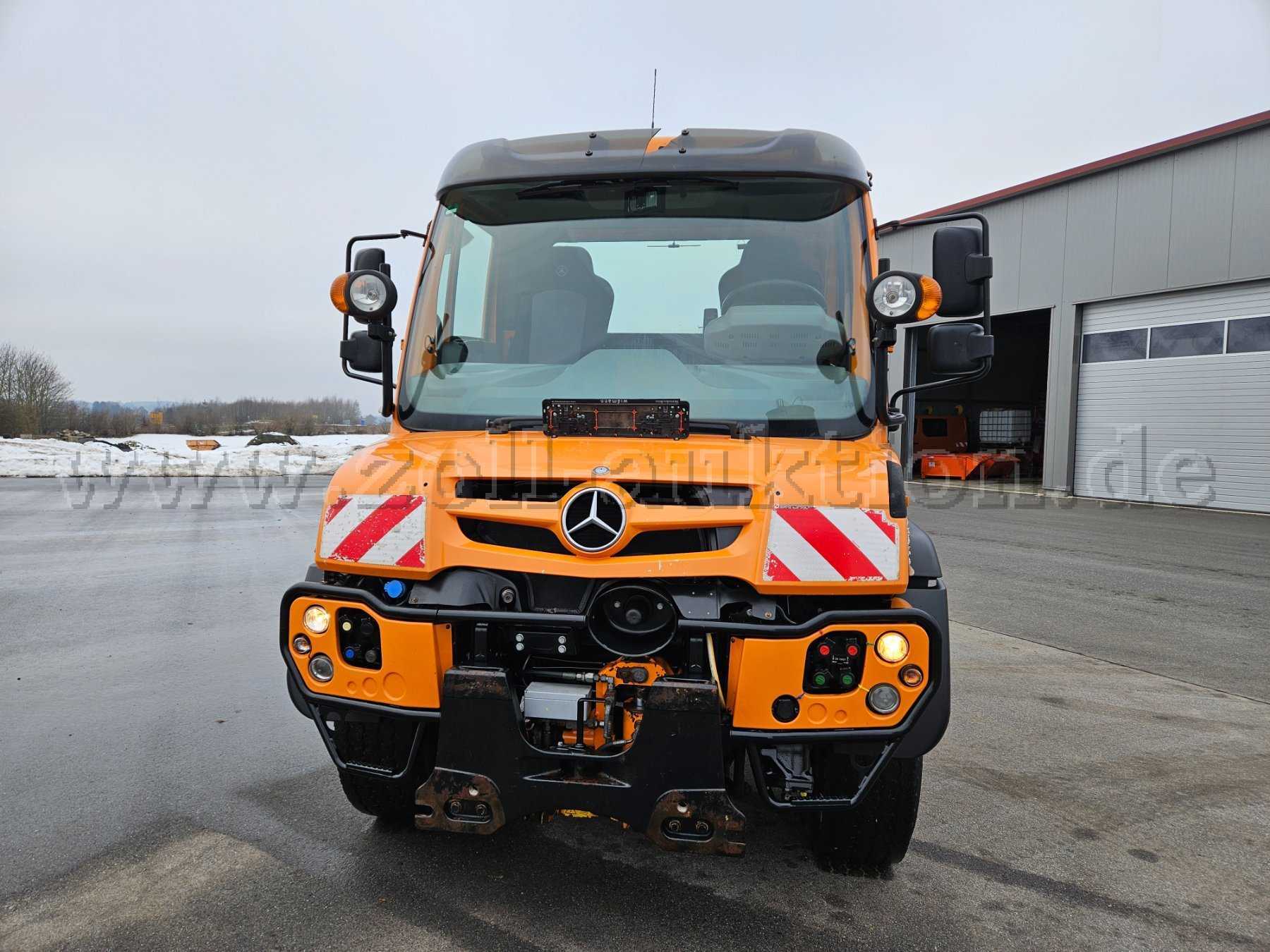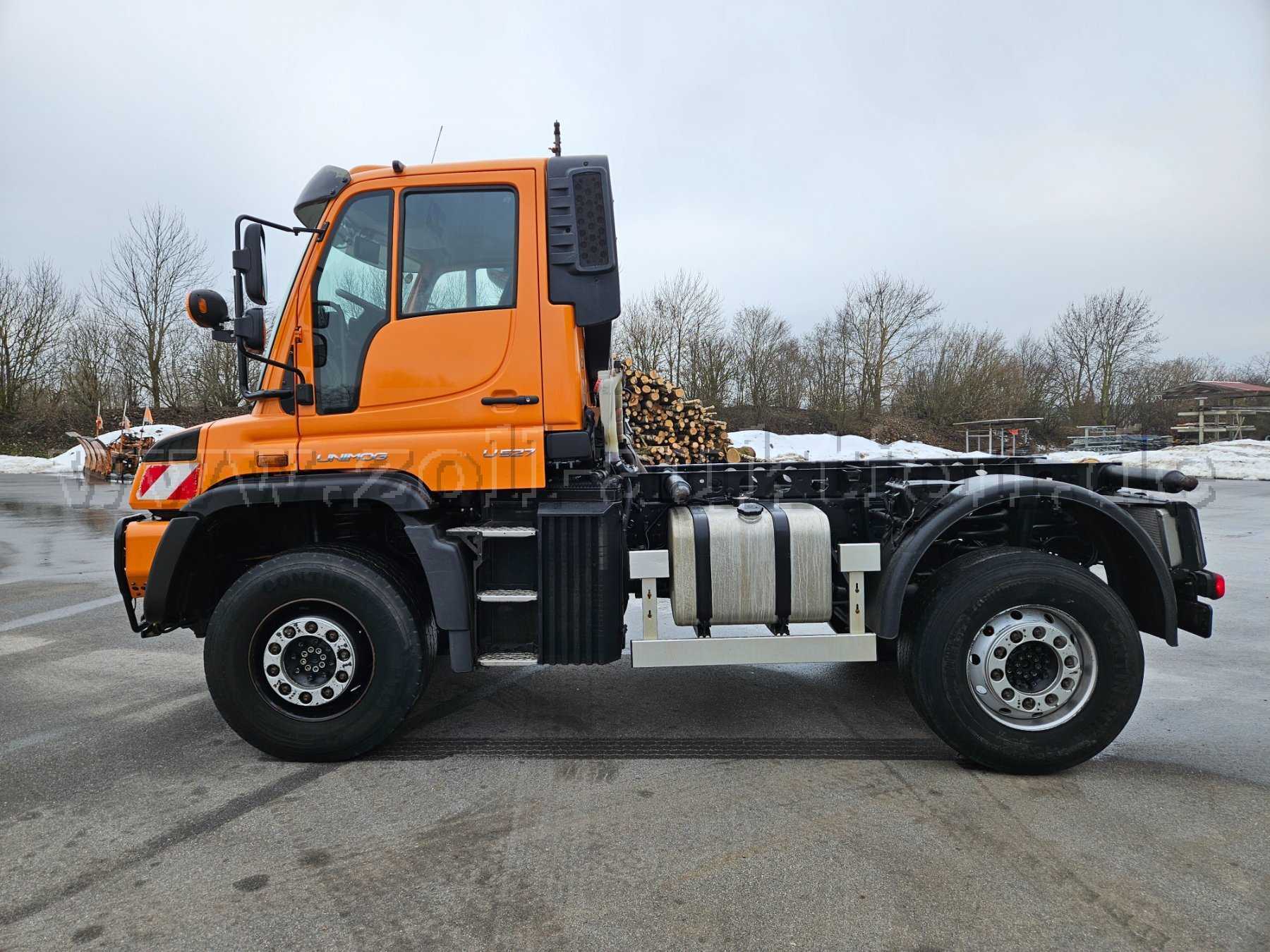 Unimog U527; Grundmodell Unimog mit Kommunalausstattung; Frontanbauplatte; Zusatzhydraulikanlage für Anbaugeräte; Torsionsrahmen; Sonnenblende außen; Anhängerkupplung; Rückfahrkamera; Radio; Hydrostat; Dachantenne; Zapfwelle vorne; Klimaanlage