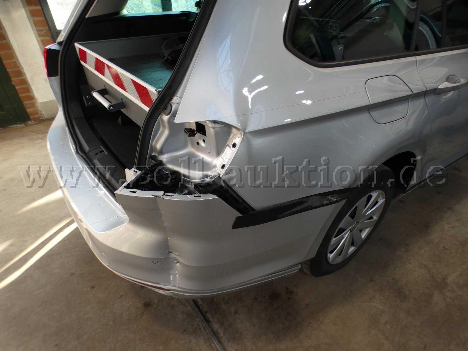 Unreparierter Unfallschaden am Fahrzeugheck, unter anderem betroffene Bauteile: Heckschürze, Heckblech, Seitenteil rechts, Heckklappe und Rücklicht rechts beschädigt;