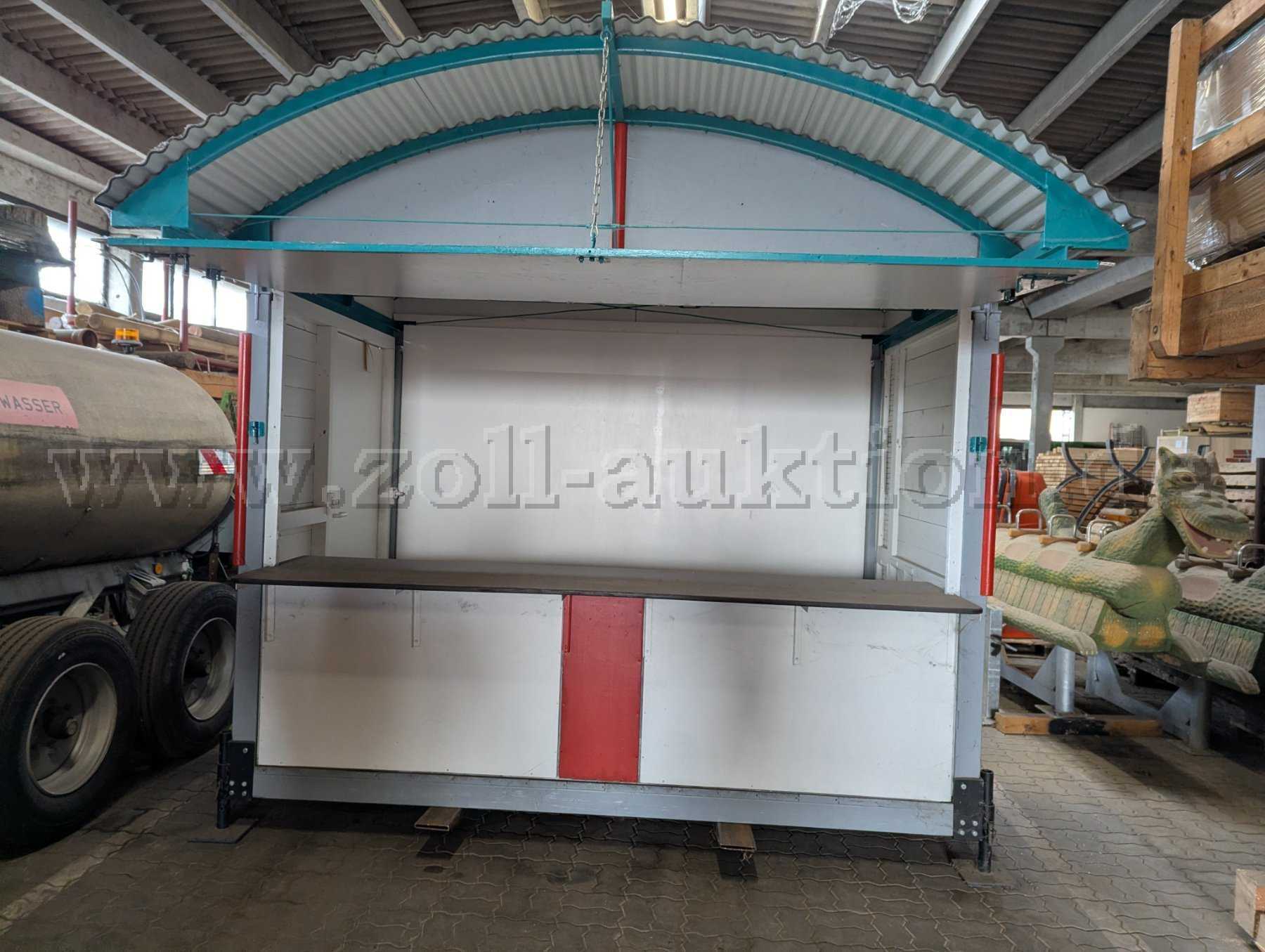 Versteigert wird ein Verkaufsstand aus Holz mit stabilem Wellblechdach in gutem Zustand. Er wurde rund 6 Monate als Info-Stand im Freien verwendet und anschließend mehrere Jahre in einer trockenen, gut belüfteten Halle gelagert. Die Lackierung ist stellenweise ungleichmäßig. Die Holzkonstruktion ist unbeschädigt. Lagerspuren in Form von Staub, kleinen, nicht tiefen Kratzern sind vorhanden. Der Boden des Verkaufsstandes wurde komplett erneuert und ist in neuwertigem Zustand. Durch höheneinstellbare Standfüße kann der Verkaufsstand auch in unebenem Gelände genutzt werden.