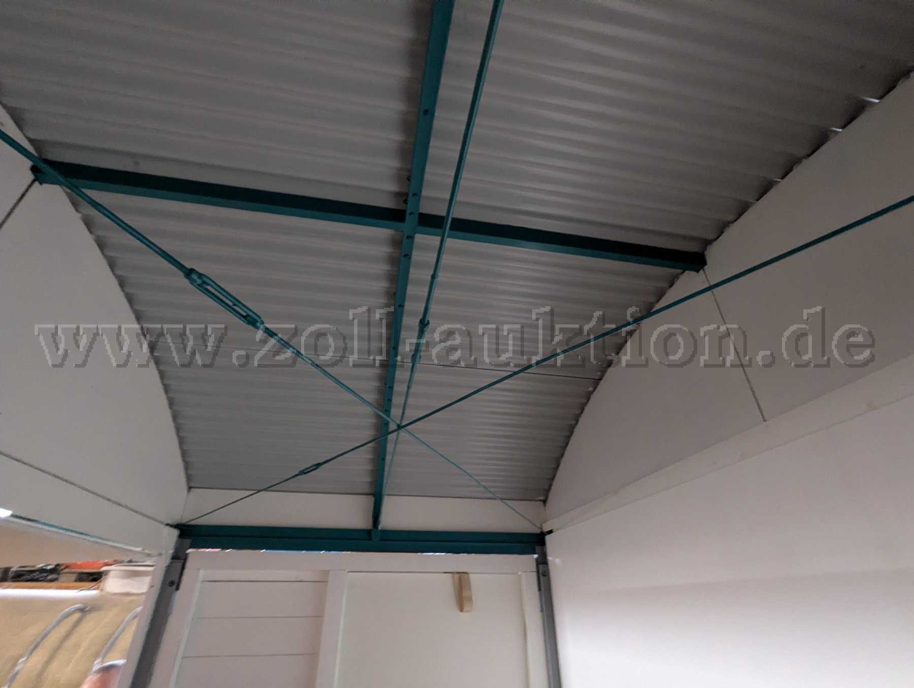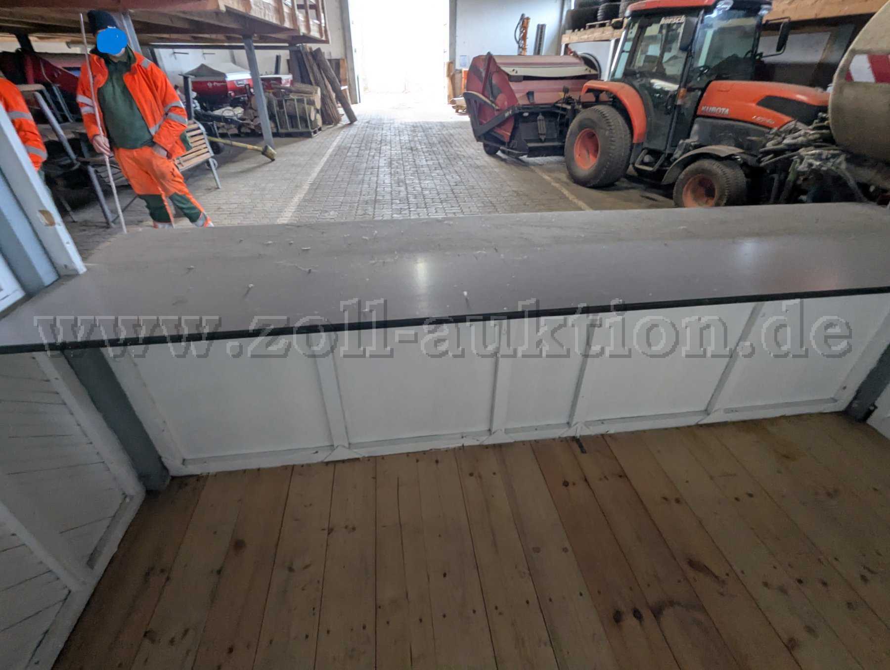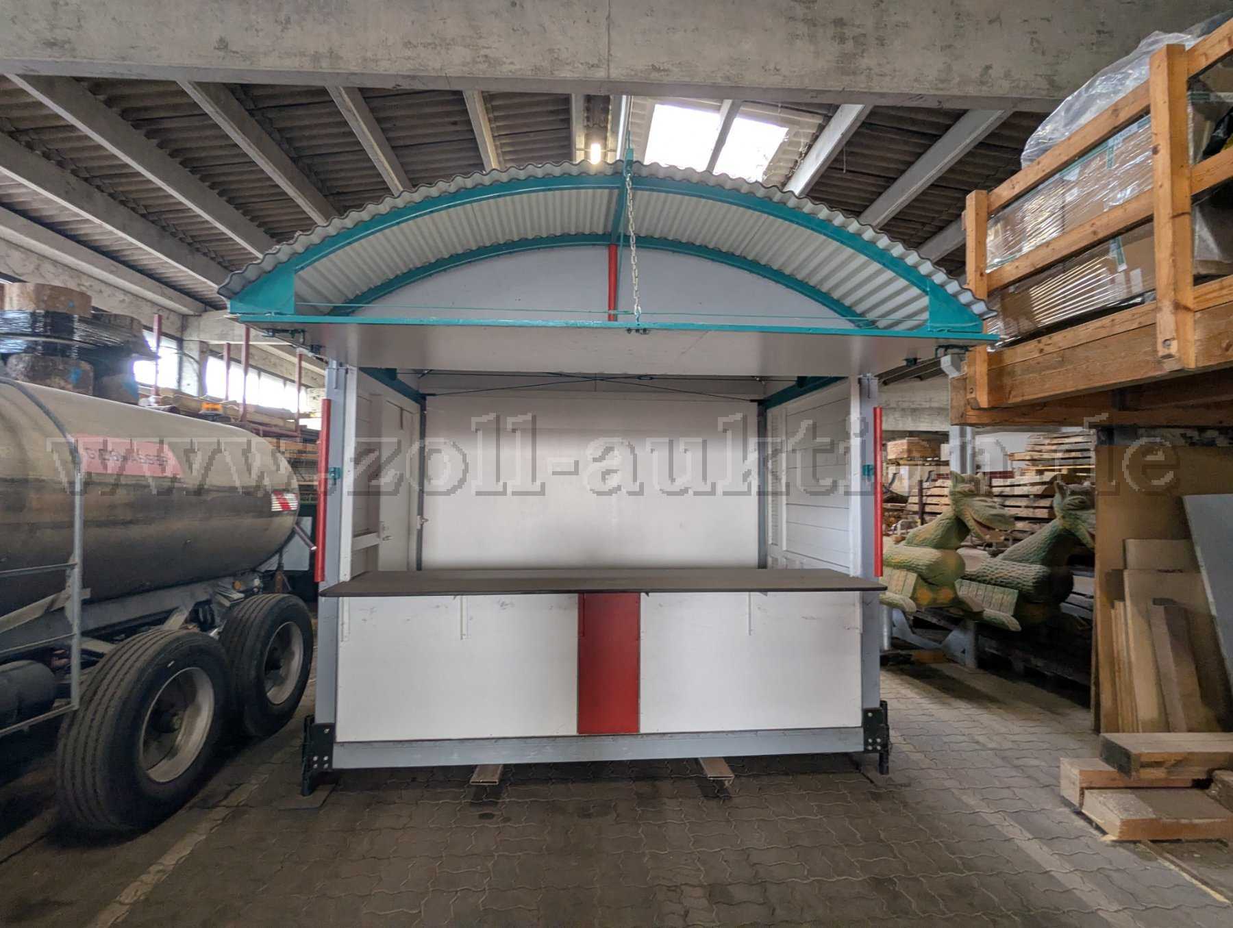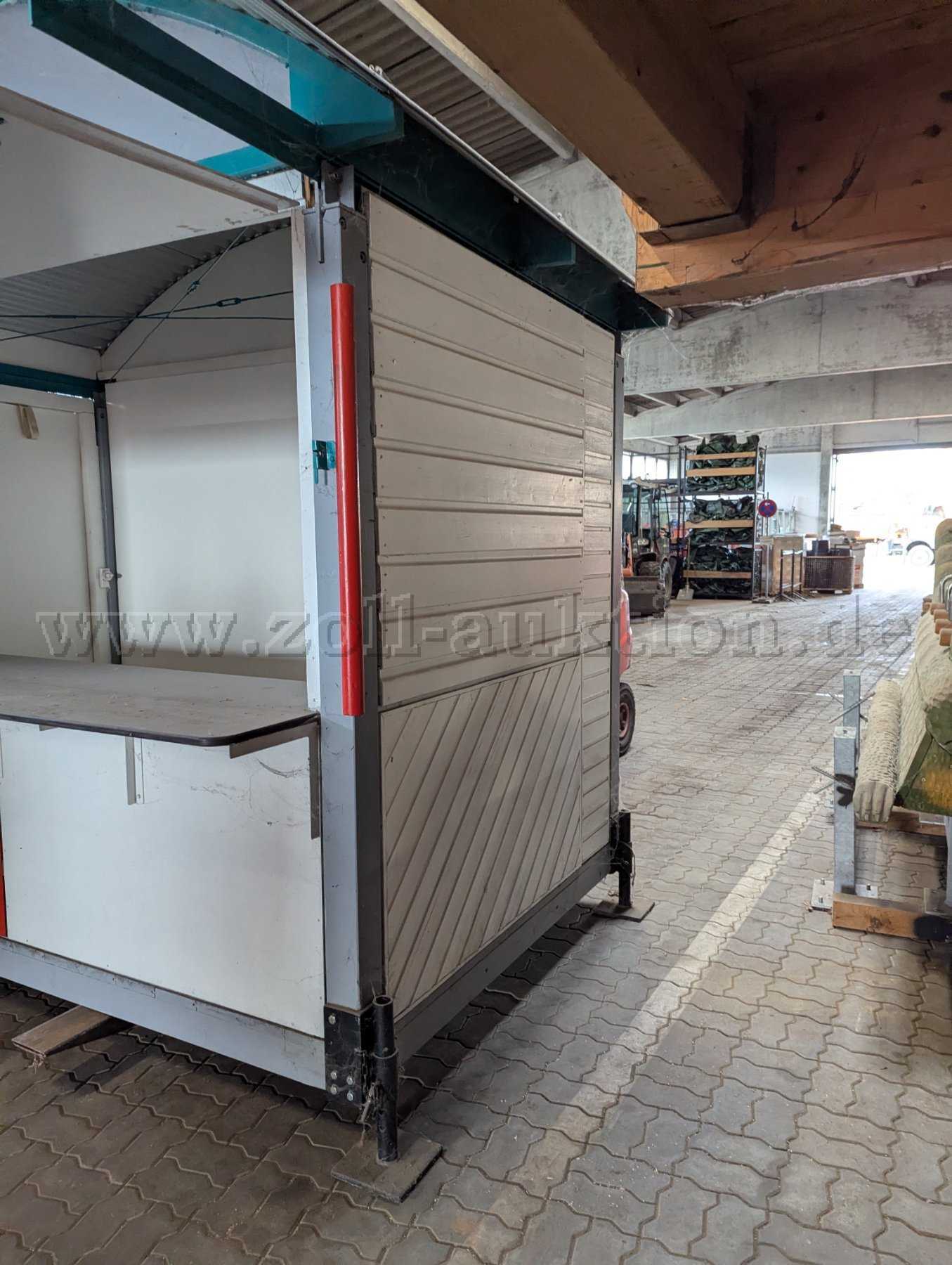 Versteigert wird ein Verkaufsstand aus Holz mit stabilem Wellblechdach in gutem Zustand. Er wurde rund 6 Monate als Info-Stand im Freien verwendet und anschließend mehrere Jahre in einer trockenen, gut belüfteten Halle gelagert. Die Lackierung ist stellenweise ungleichmäßig. Die Holzkonstruktion ist unbeschädigt. Lagerspuren in Form von Staub, kleinen, nicht tiefen Kratzern sind vorhanden. Der Boden des Verkaufsstandes wurde komplett erneuert und ist in neuwertigem Zustand. Durch höheneinstellbare Standfüße kann der Verkaufsstand auch in unebenem Gelände genutzt werden.