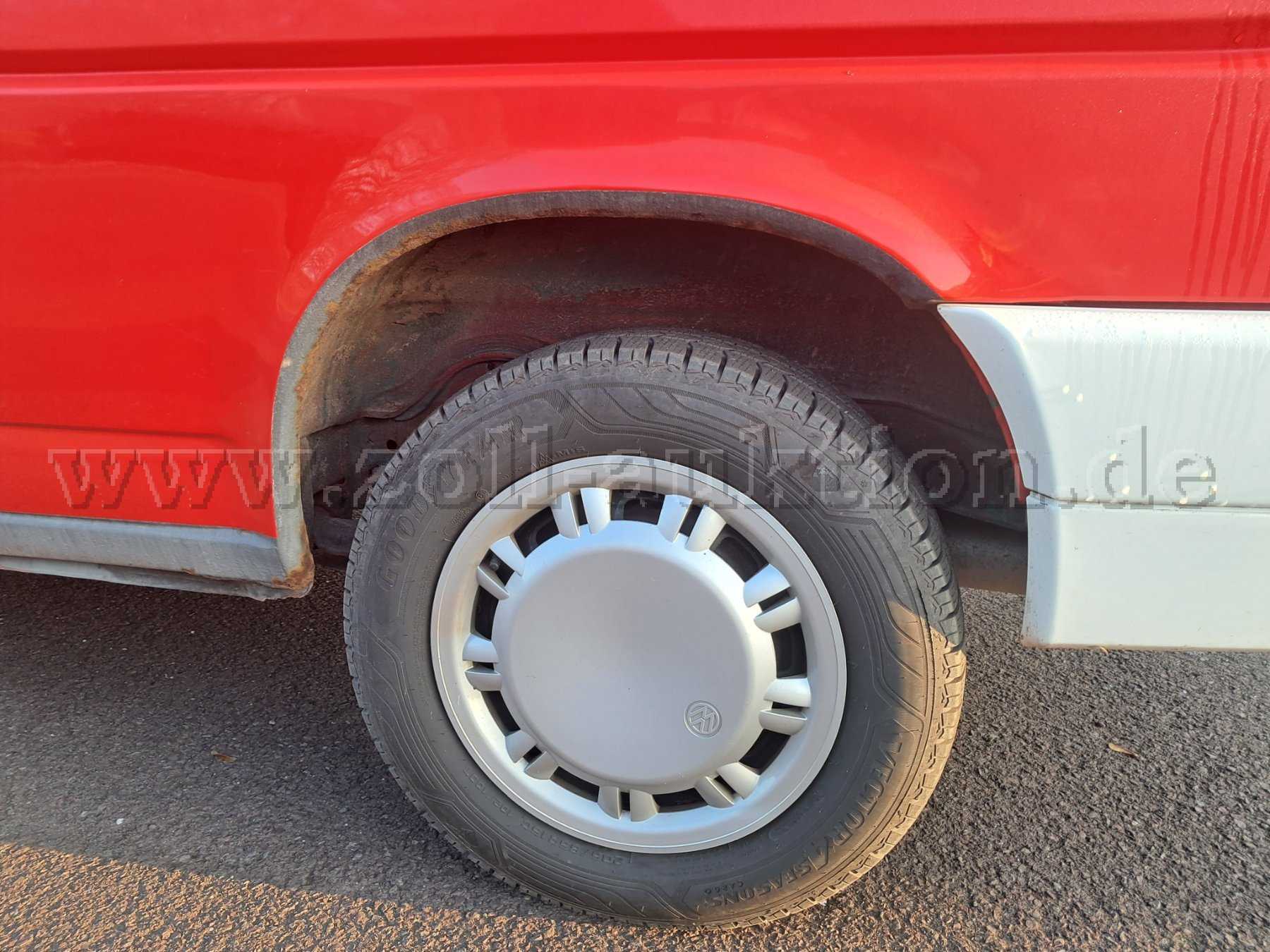Das Fahrzeug weist diverse alters- und gebrauchsbedingte Schäden (Kratzer, Dellen, Korrosion am Schweller sowie an den Radläufen, Lackabsplitterungen, geklebter Spiegel) auf.