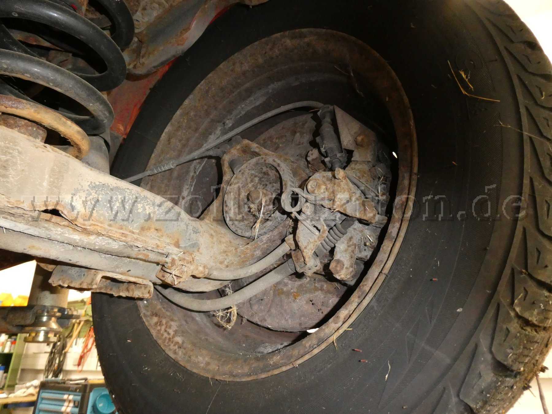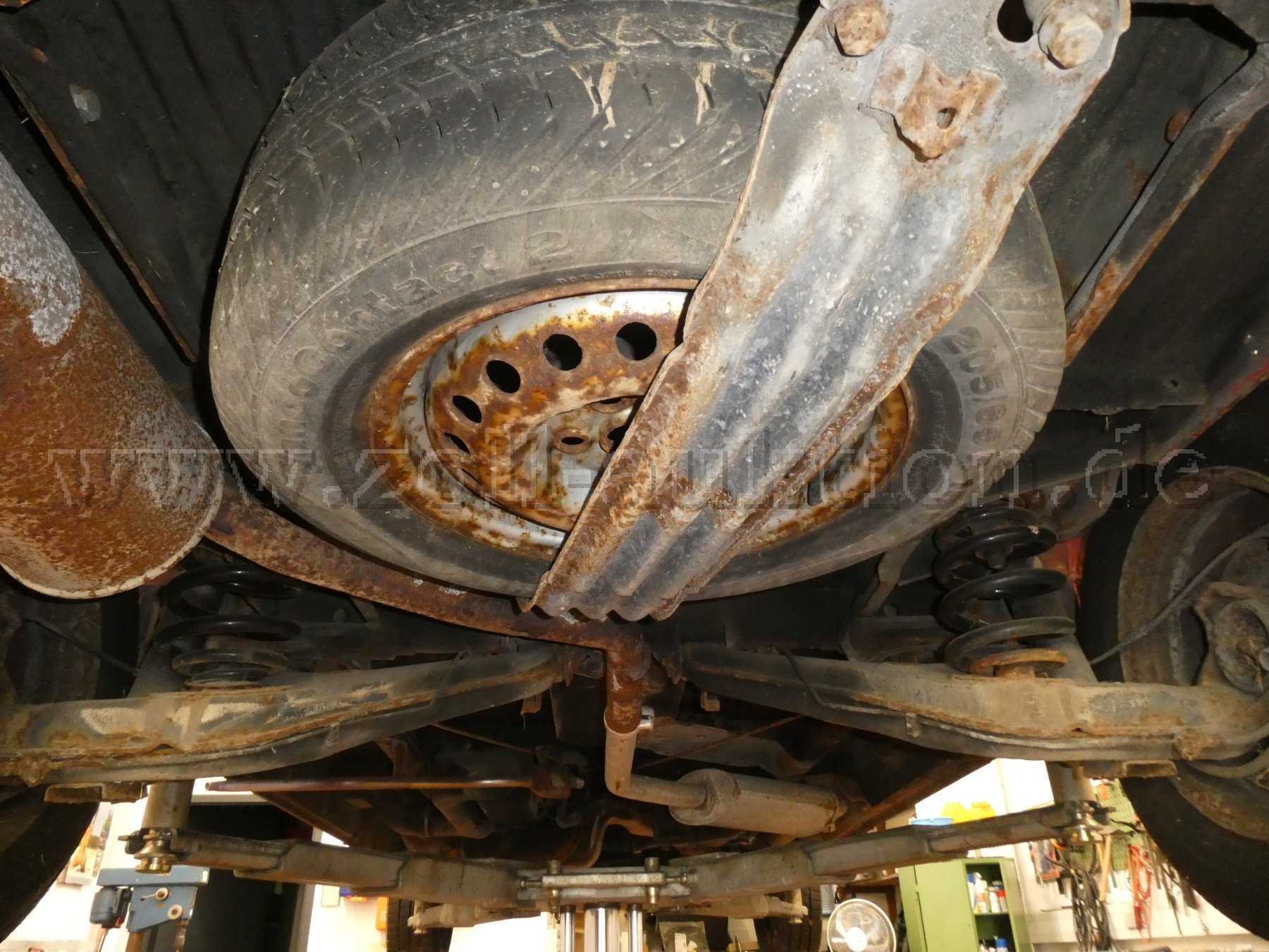 Deutliche Verschleiß-, Gebrauchs- und Abnutzungsspuren vorhanden. Sichtbare Korrosion an Bodengruppe, Achsaufhängung und Bremsleitungen.