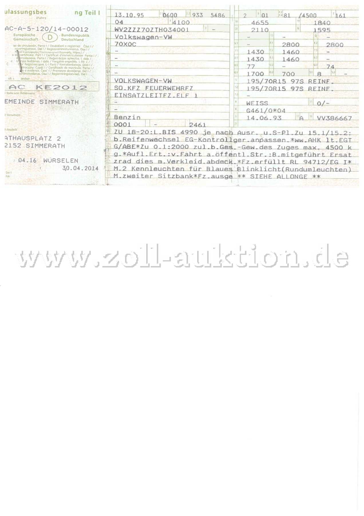 - Das Fahrzeug wird als Einsatzfahrzeug versteigert und ist in diesem Zustand nur durch Aufgabenträger im Brand- oder Katastrophenschutz/Rettungsdienst zulassungsfähig.