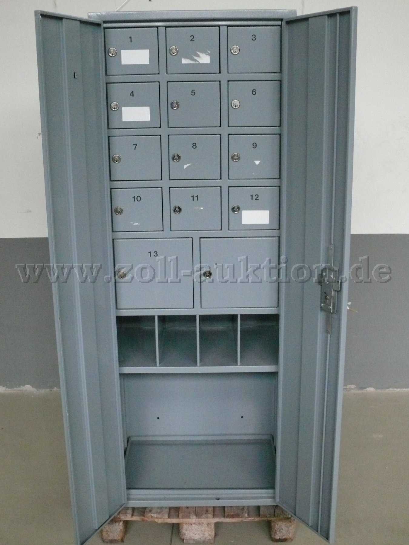 - der Schrank hat 12 kleine abschließbare Fächer, 2 größere abschließbare Fächer, 4 kleine offene Fächer und 1 größeres offenes Fach