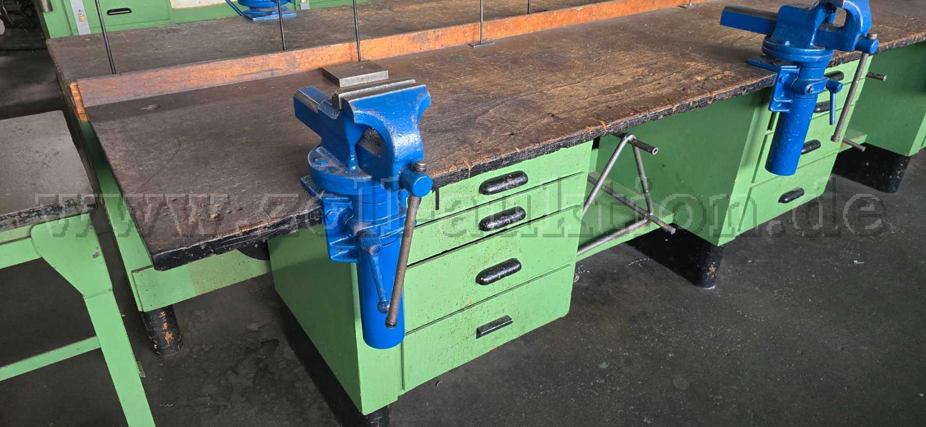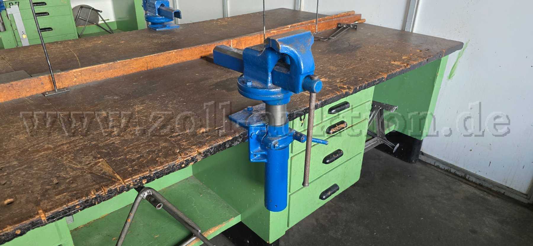 Werkbankkombination (3 Fach) aus Holz. Ausgestattet mit drei höhenverstellbaren Schraubstöcken. Ideal für Werkstatt, Montage, Ausbildung, Schlosserei oder Instandhaltung.