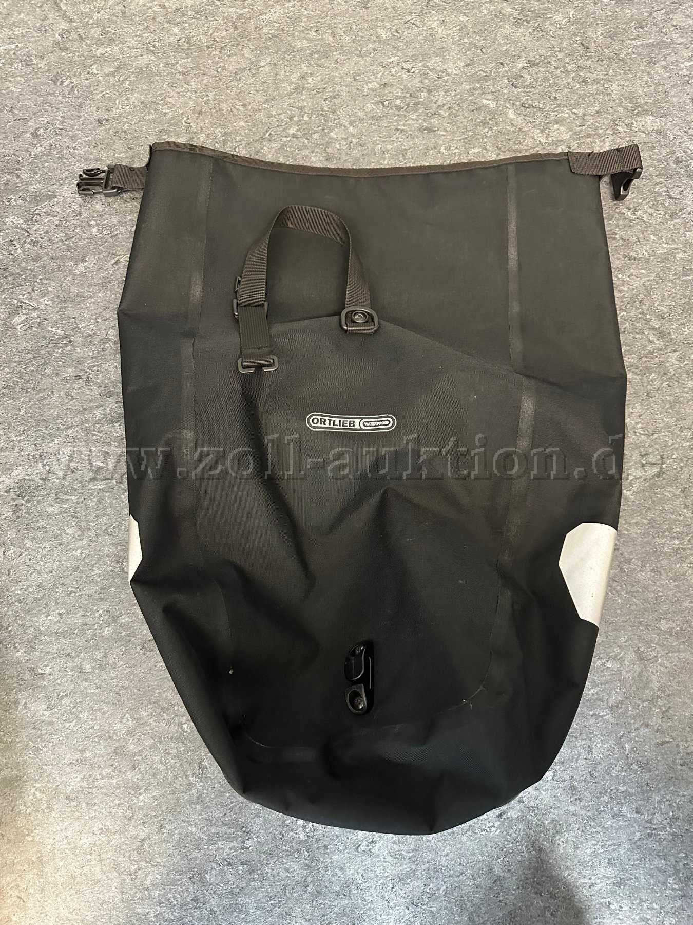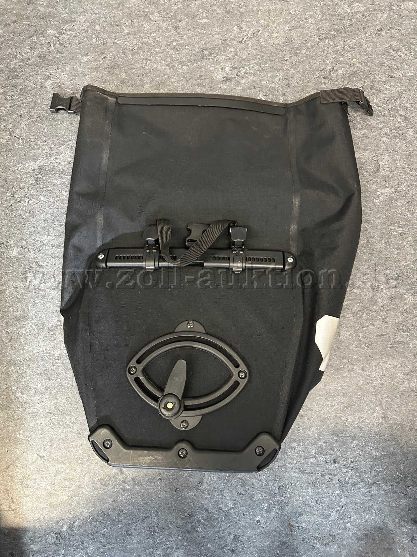 1 gebrauchte Fahrradtasche des Herstellers ORTLIEB in schwarz; Höhe 42 cm, Breite 32 cm, Tiefe 17 cm, Volumen 20 l, Zuladung 9 kg, Gewicht 950 gr., wasserdicht, Quicklock-Aufhängsystem.