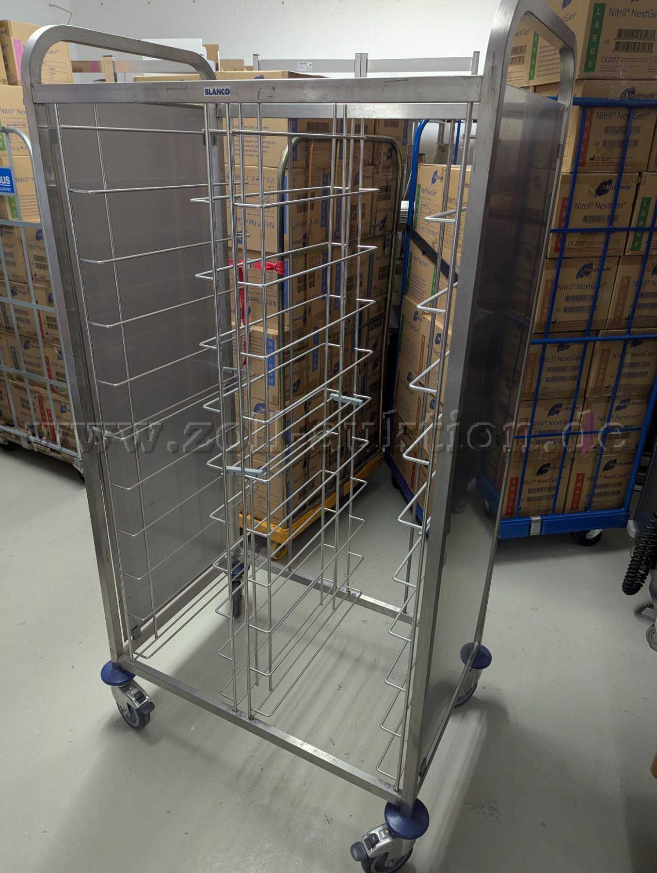 Veräußert werden 2 Blanco Tablett‑Abräumwagen 2×12 GN – Gebraucht (Stainless Steel, Kunststoffrollen):
