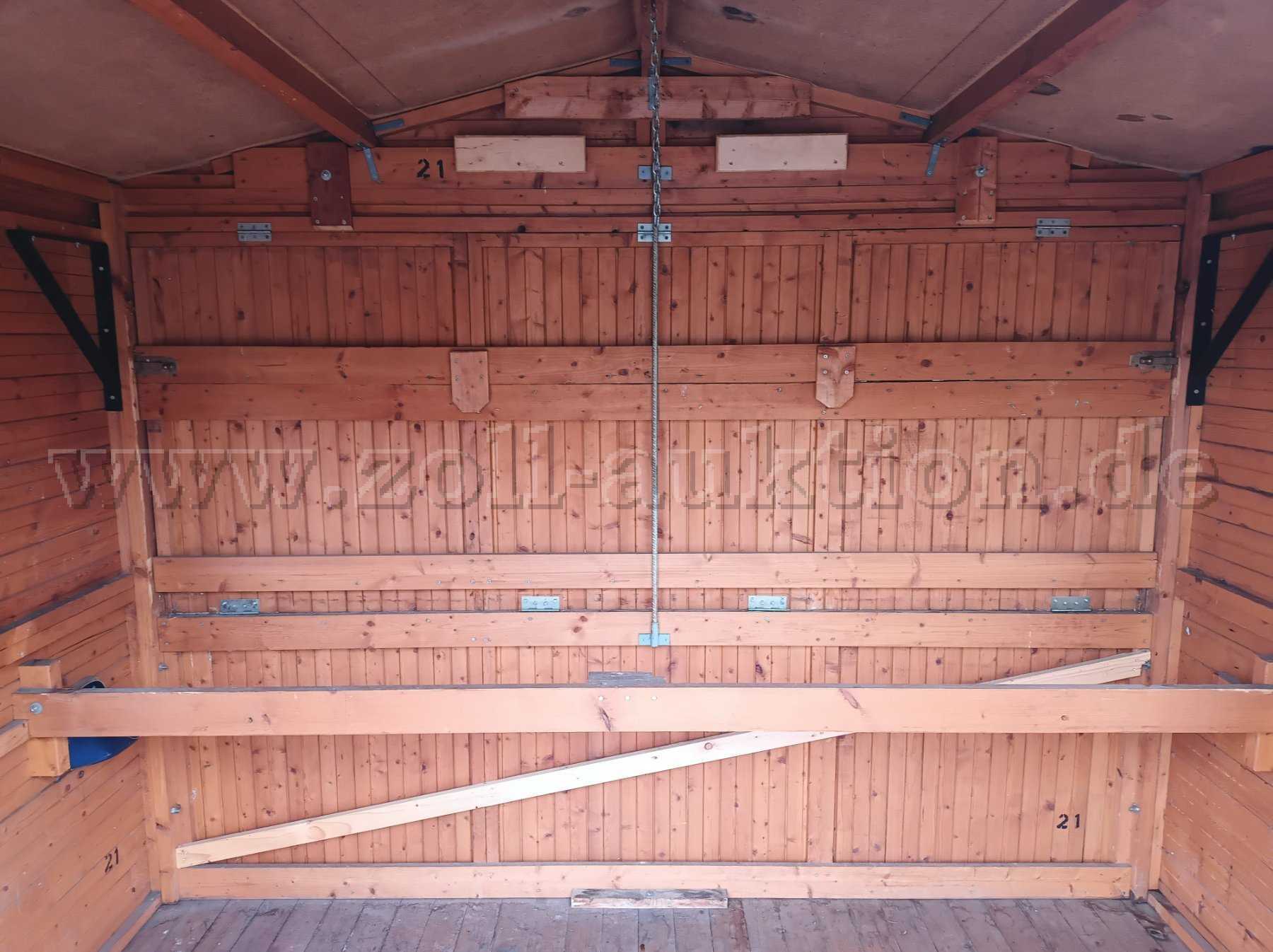 Der Zugang in die Hütten ist von hinten über eine Doppel Flügeltür möglich. Die Vorderseite kann aufgeklappt werden, so dass aus einem Teil der vorderen Wand die Verkaufs Teke wird.