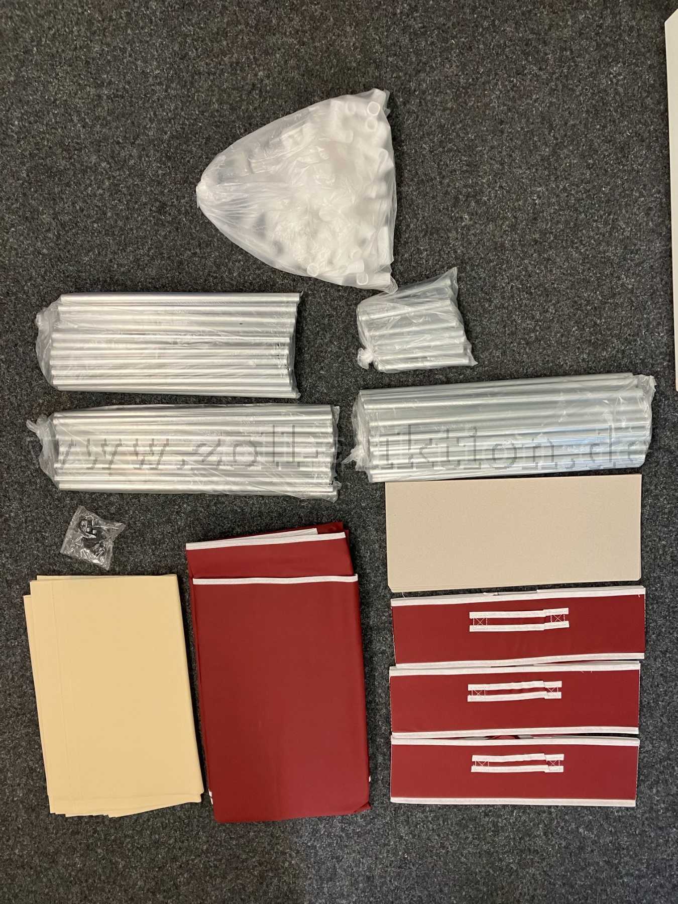 Zwei neue und originalverpackte Stoffkleiderschränke in der Farbe rot/beige.